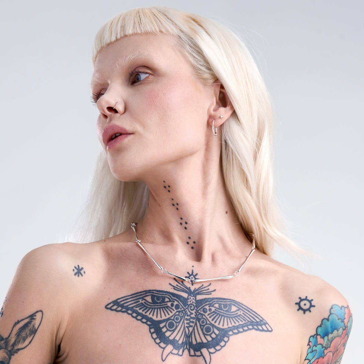 Delikatny naszyjnik został wykonany z połączonych ze sobą, podłużnych kropel. Poszczególne elementy są różnej długości, co podkreśla oryginalny charakter ręcznie wykonanej biżuterii. Dzięki przedłużce, zakończonej metalową kroplą, srebrny naszyjnik ma możliwość regulacji długości. Tuż przy zapięciu naszyjnik został opatrzony okrągłą nieregularna pieczęcią “made by Homo Sapiens”. Nawiązując do przesłania kolekcji przypomina ona o odpowiedzialności za dzieła, które tworzymy i ich wpływ na przyrodę. Opływowy, nieregularny kształt elementów tworzących naszyjnik, kojarzy się z wodą, która zbyt często staje się docelową destynacją dla jednorazowego plastiku.