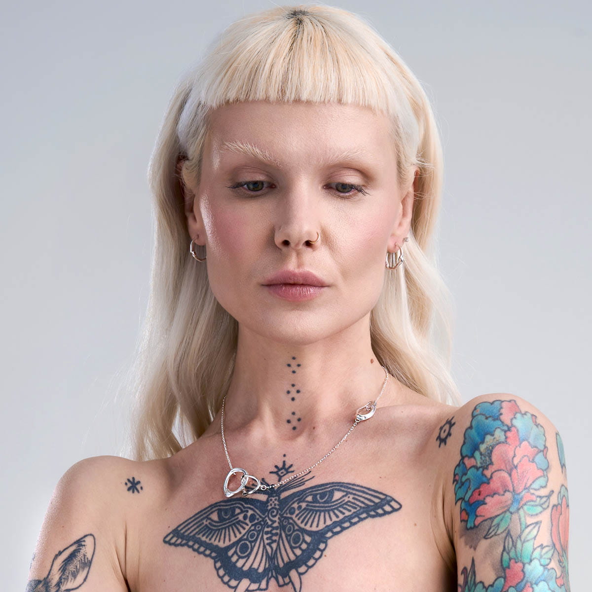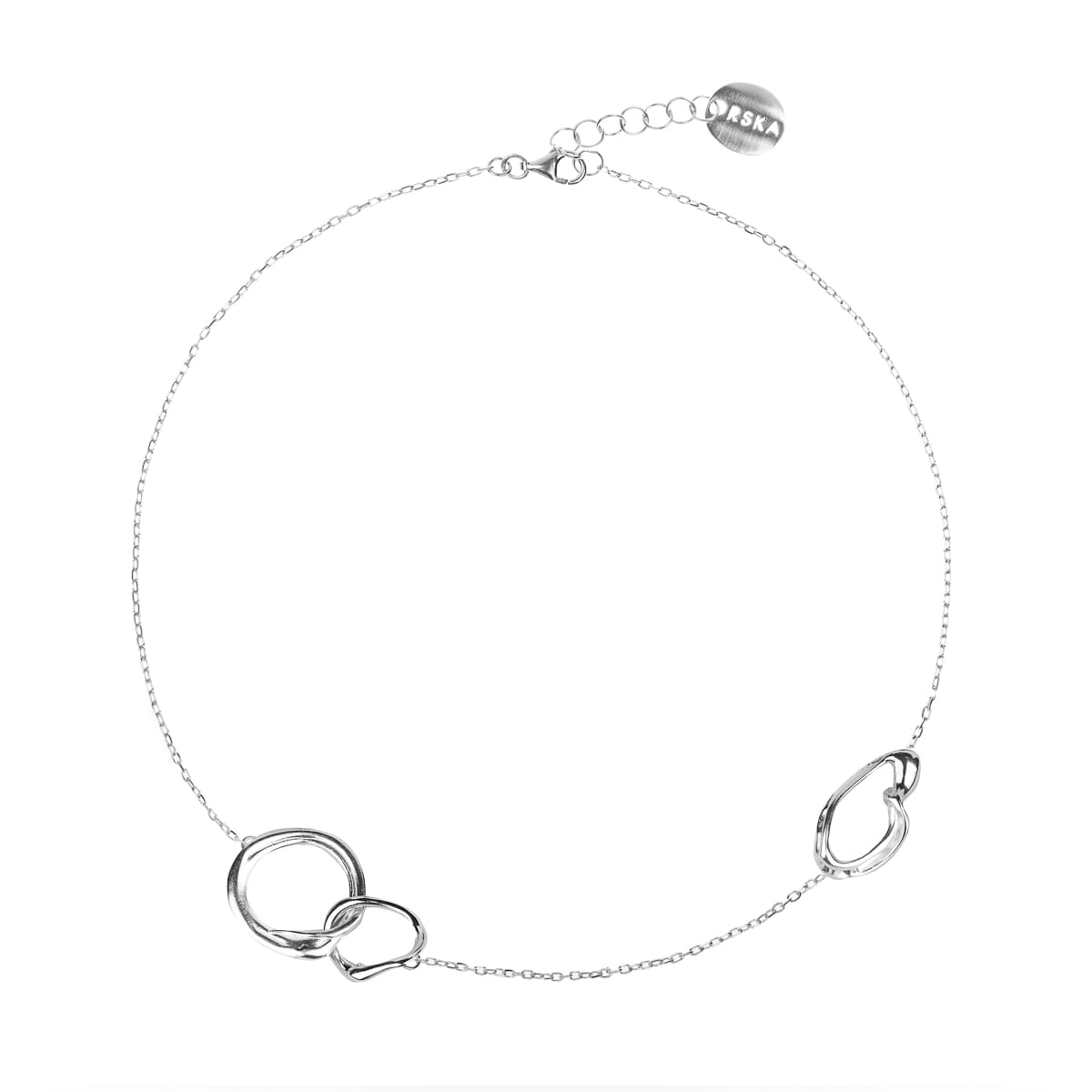 Krótki naszyjnik wykonano ręcznie ze srebra. Biżuteria łączy delikatny łańcuszek z asymetrycznymi zawieszkami w postaci okręgów. Trzy nieregularne ogniwa różnią się od siebie wielkością i kształtem. Pofalowana struktura sprawia, że wyglądają jakby były wykonane z lejącego się srebra. Wypolerowane na wysoki połysk jasne zawieszki nawiązują do tafli wody, w której jednorazowy plastik często kończy swój żywot. Ręcznie wykonany ze srebra naszyjnik, ma możliwość regulacji długości – krótką przedłużkę na końcu ozdobiono okrągłym logiem ORSKA.