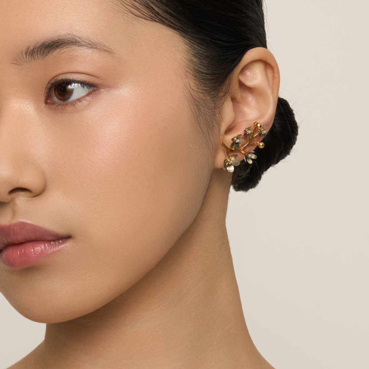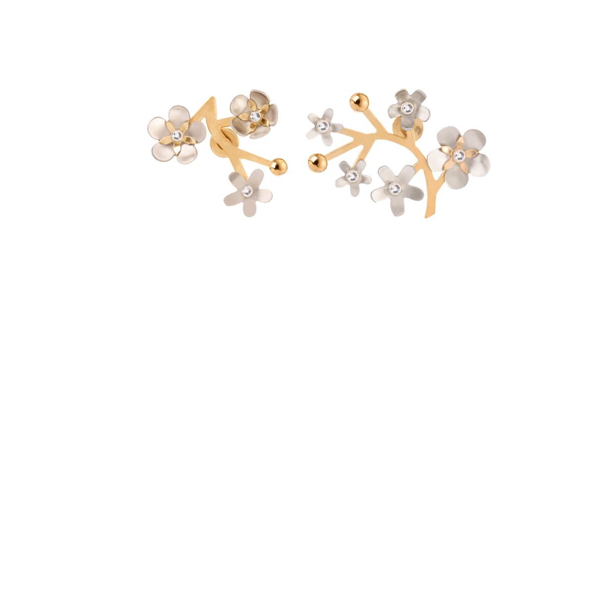 Na każdej stworzonej z pozłacanego mosiądzu gałązce rozkwitły kwiaty wiśni o różnej wielkości. Kwiaty zostały uformowane z alpaki, metalu o chłodnym, srebrzystym połysku, który w zestawieniu ze złoconą gałązką tworzy klasyczne połączenie. A następnie skręcone za pomocą jubilerskich śrubek niczym origami. Dzięki temu zabiegowi nie są miękkie i romantyczne, lecz geometryczne, precyzyjne i charakterne. Pręciki kwiatów wykonano z pozłacanego mosiądzu - ich złoty połysk nadaje kompozycji lekkości i blasku. W centrum każdego kwiatu umieszczono lśniący syntetyczny kryształ. Kolczyki są asymetryczne, dzięki temu dobrze oddają naturalny, nieidealny układ gałęzi i kwiatów, które nigdy nie rozkwitają w identyczny sposób. Kolczyki zostały wykonane ręcznie w naszej pracowni. Są zapinane na wygodny sztyft ze srebra. Do sztyftu przy zapięciu jednego z kolczyków przytwierdzona jest ozdobna zawieszka w postaci drobnego łańcuszka zakończonego srebrną, pozłacaną kuleczką. Zawieszkę można odczepić i nosić kolczyk bez niej lub przypiąć ją do innej pary kolczyków.