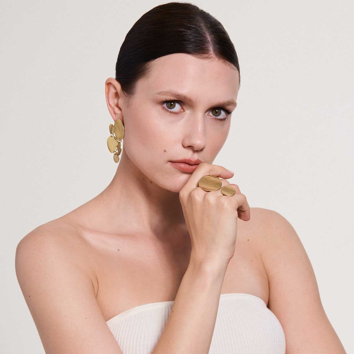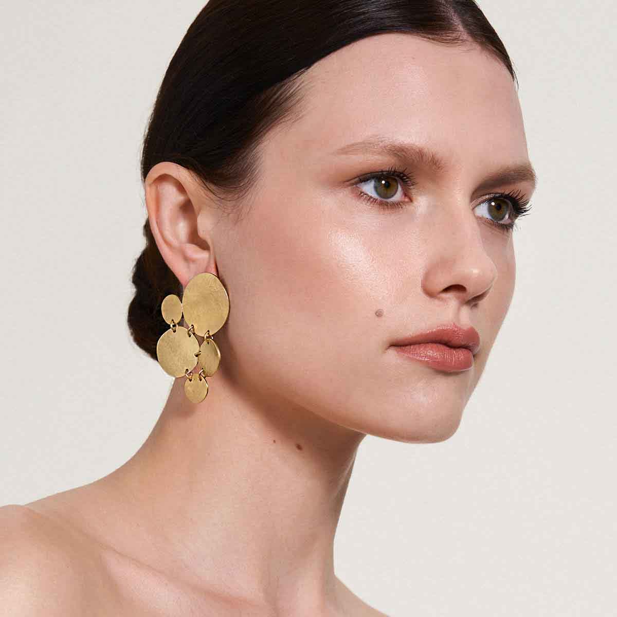 Kolczyki powstały dzięki ręcznej pracy jubilerów w warsztacie ORSKA. Bazą obu kolczyków jest okrągły plaster z pozłacanego mosiądzu o nieregularnej strukturze. Jeden z kolczyków dodatkowo ozdobiony został czterema mniejszymi dyskami o różnej wielkości. Na kompozycję składają się cztery złote elementy, które w oryginalną układankę łączą drobne ogniwa. Pofalowana struktura i kuta powierzchnia metalu nawiązują do żywiołu wody, przewodniej inspiracji kolekcji Rundo. Asymetryczna forma zwraca uwagę na kolczyki i nie pozwala przejść obok nich obojętnie.