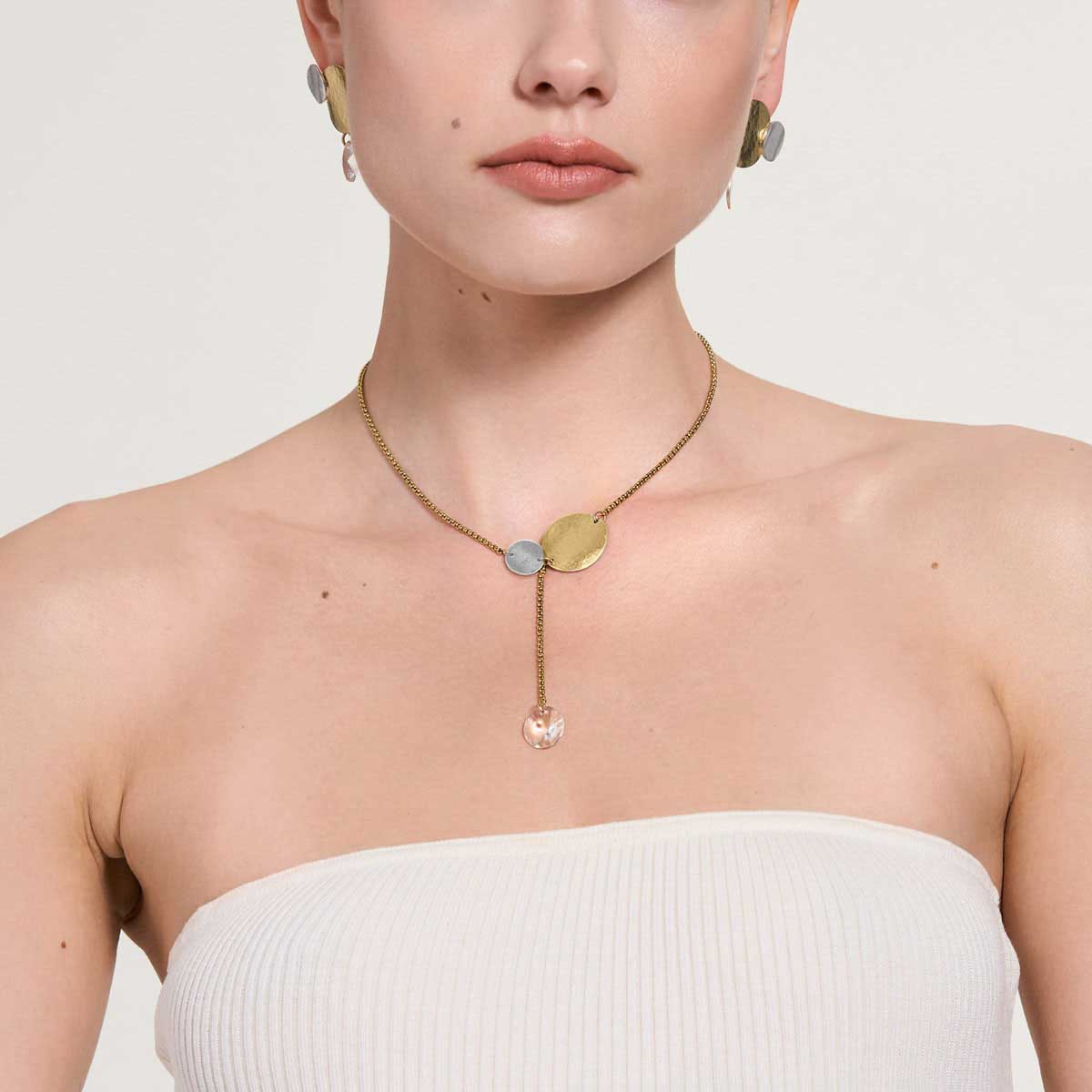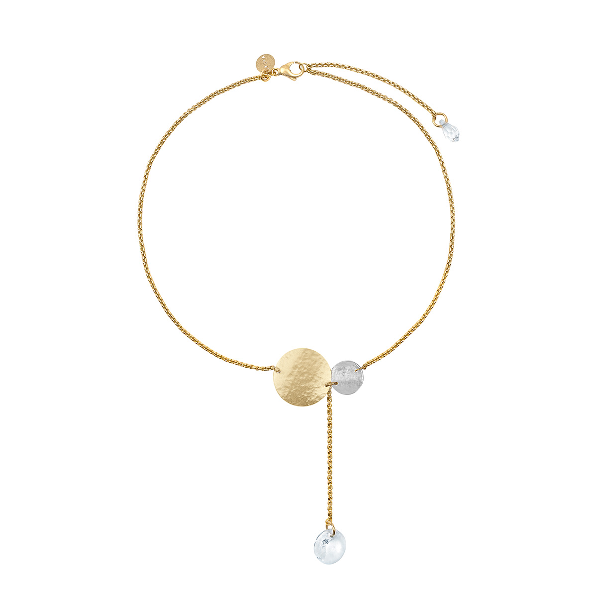Artystyczny naszyjnik z kolekcji Rundo został wykonany ręcznie z pozłacanego mosiądzu i srebra. Delikatny łańcuszek o splocie kostki zdobią dwie kryształowe zawieszki: jedna z przodu i druga z tyłu. Kompozycję zamyka małe logo ORSKA oraz zapięcie na karabińczyk. Okrągłe formy i kuta ręcznie powierzchnia oddają symbolikę żywiołu wody będącego tematem kolekcji Rundo. Choć naszyjnik doskonale prezentuje się solo, lubi też towarzystwo pozostałych wzorów z kolekcji Rundo – szeroka bransoleta typu mankiet lub pierścionek z dwoma, metalicznymi oczkami utworzą wraz z nim duet, obok którego nie da się przejść obojętnie.