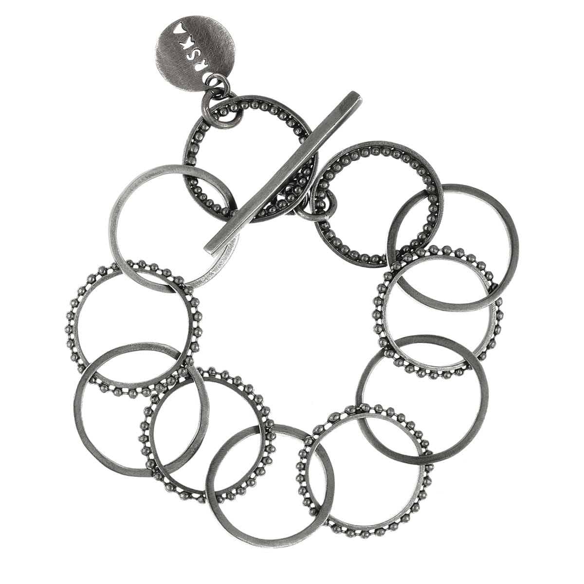 Klasyczna bransoletka została wykonana ręcznie ze srebra. Prostą formę ubogaca wykorzystanie różnorodnych ogniw tej samej wielkości oraz ich nieregularne rozmieszczenie. Zapinana na ozdobny skobelek rytmicznie dźwięczy przy każdym ruchu. Dzięki uniwersalnemu charakterowi i eleganckiej formie będzie świetnym uzupełnieniem wielu kreacji zarówno codziennych jak i wieczorowych. Minimalistyczny design sprawdzi się także w towarzystwie kolczyków i naszyjników z kolekcji RAY.