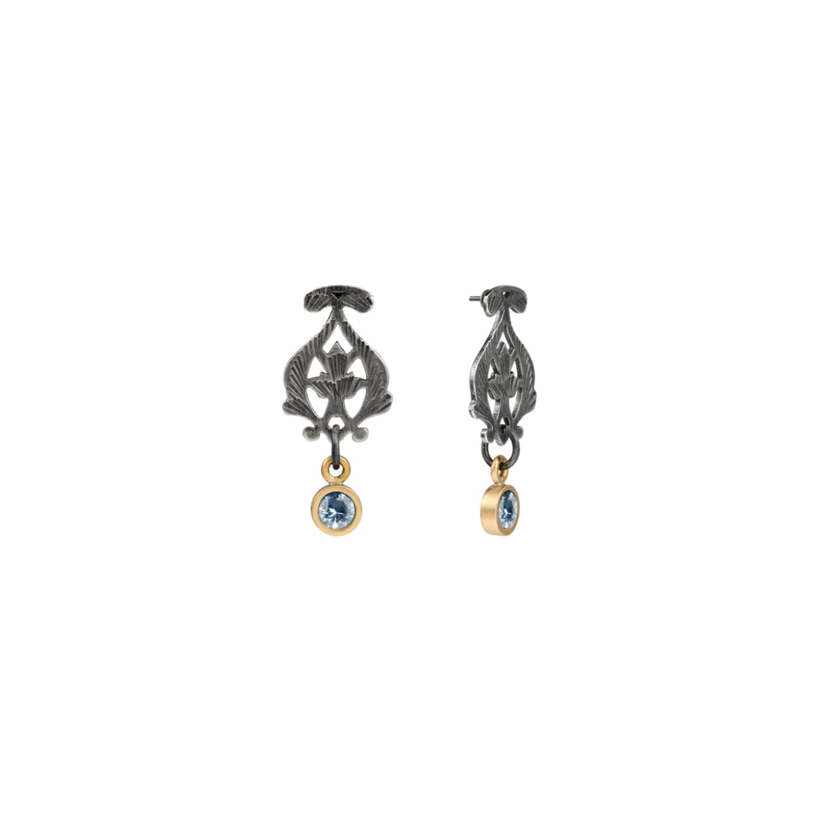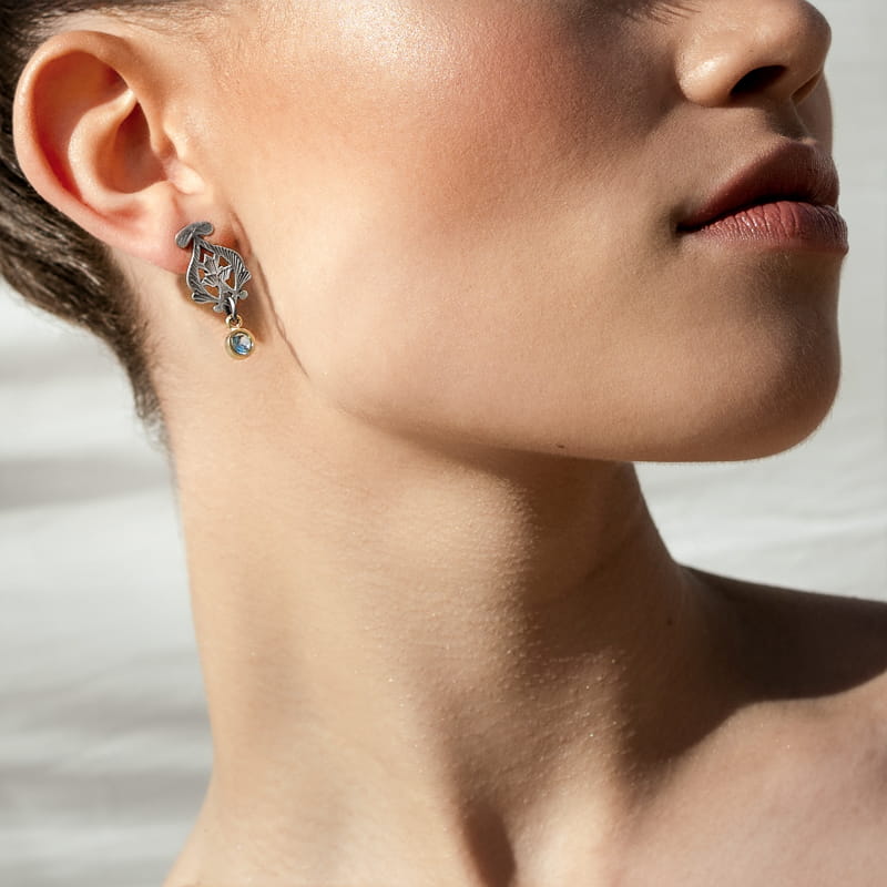 Kolczyki zostały wykonane ręcznie z alpaki w marokańskim warsztacie. Mistrzowie z Marrakeszu wycięli misterny kształt i nadali mu koronkową strukturę. Floralny wzór zaczerpnięty został z tradycyjnych marokańskich lamp, które zgodnie z tradycją islamu, bogato zdobione są kwiatami, liśćmi lub finezyjnie przenikającymi się pnączami. Chcąc podkreślić grę światłocienia, w warsztacie ORSKA symetryczne kolczyki dodatkowo zostały oksydowane, a mosiężne, wiszące oprawki udekorowano cyrkonią w kolorze morskiego błękitu.