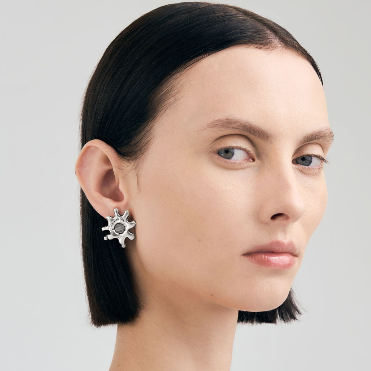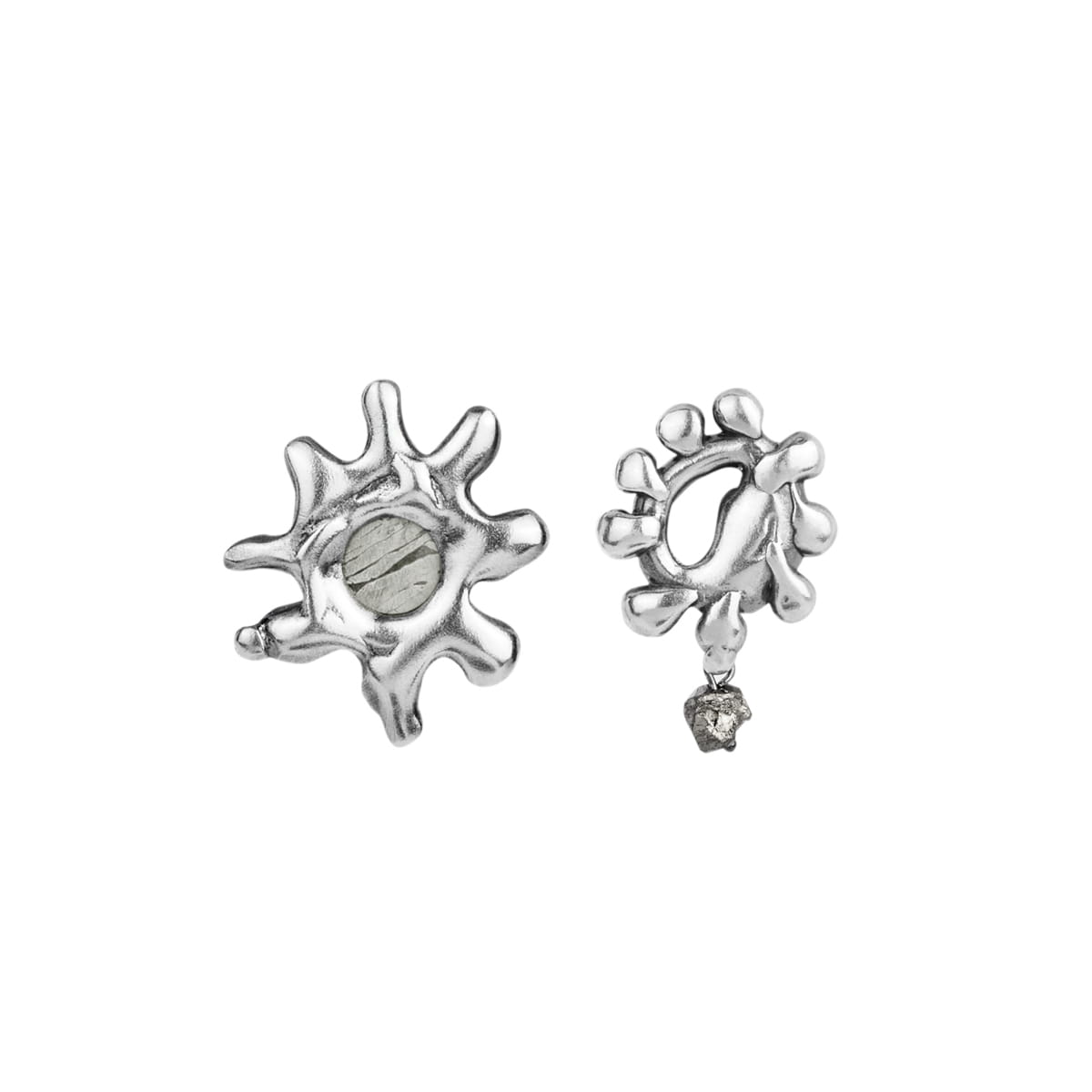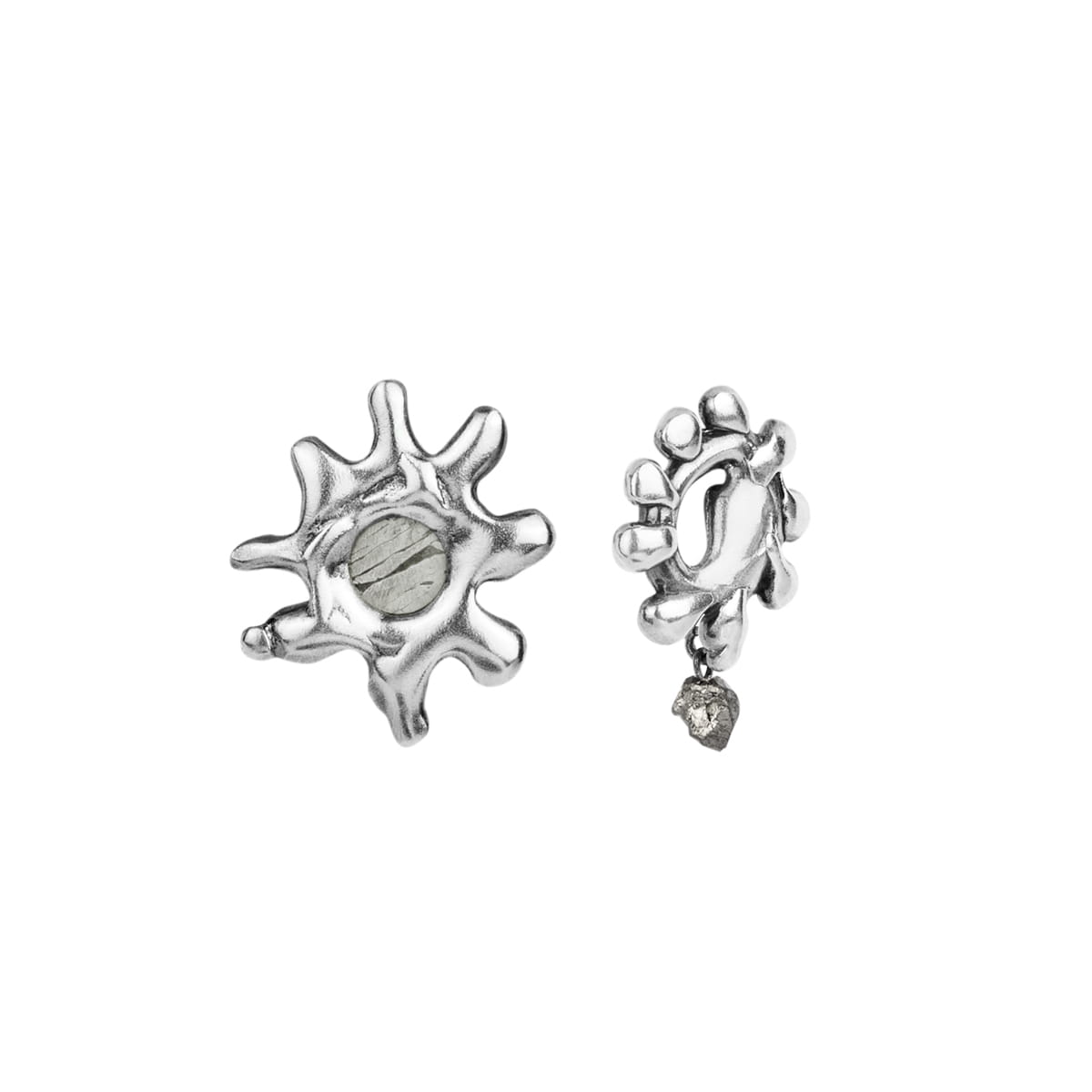 Kolczyki na sztyft z kolekcji Meteoros to połączenie najstarszego na naszej Planecie surowca i artystycznego kunsztu jubilerów ORSKA, które razem tworzą kompozycję inspirowaną niezmierzoną przestrzenią kosmosu. Kolczyki zostały wykonane ręcznie ze srebra próby 925. Dzięki metodzie lanego metalu kolczyki zyskały miękną, niemal płynną formę, która od razu przyciąga wzrok. Jeden z kolczyków ma kształt nieregularnej, rozgałęzionej formy, przypominającej eksplozję gwiezdnej materii, w którego centrum osadzono fragment meteorytu Aletai. Kamień jest okrągły, o naturalnej srebrzystej powierzchni i jodełkowej strukturze. Ujawniająca się po szlifowaniu meteorytu kompozycja zwana jest wzorem Widmanstaetena. Szaro-stalowa barwa meteorytu przenika się z błyszczącym srebrem otaczającej go oprawy. Drugi, asymetryczny kolczyk posiada nieregularną formę z wydłużonymi, zaokrąglonymi wypustkami i dodatkowo ozdobiony jest wiszącym, fasetowanym pirytem.