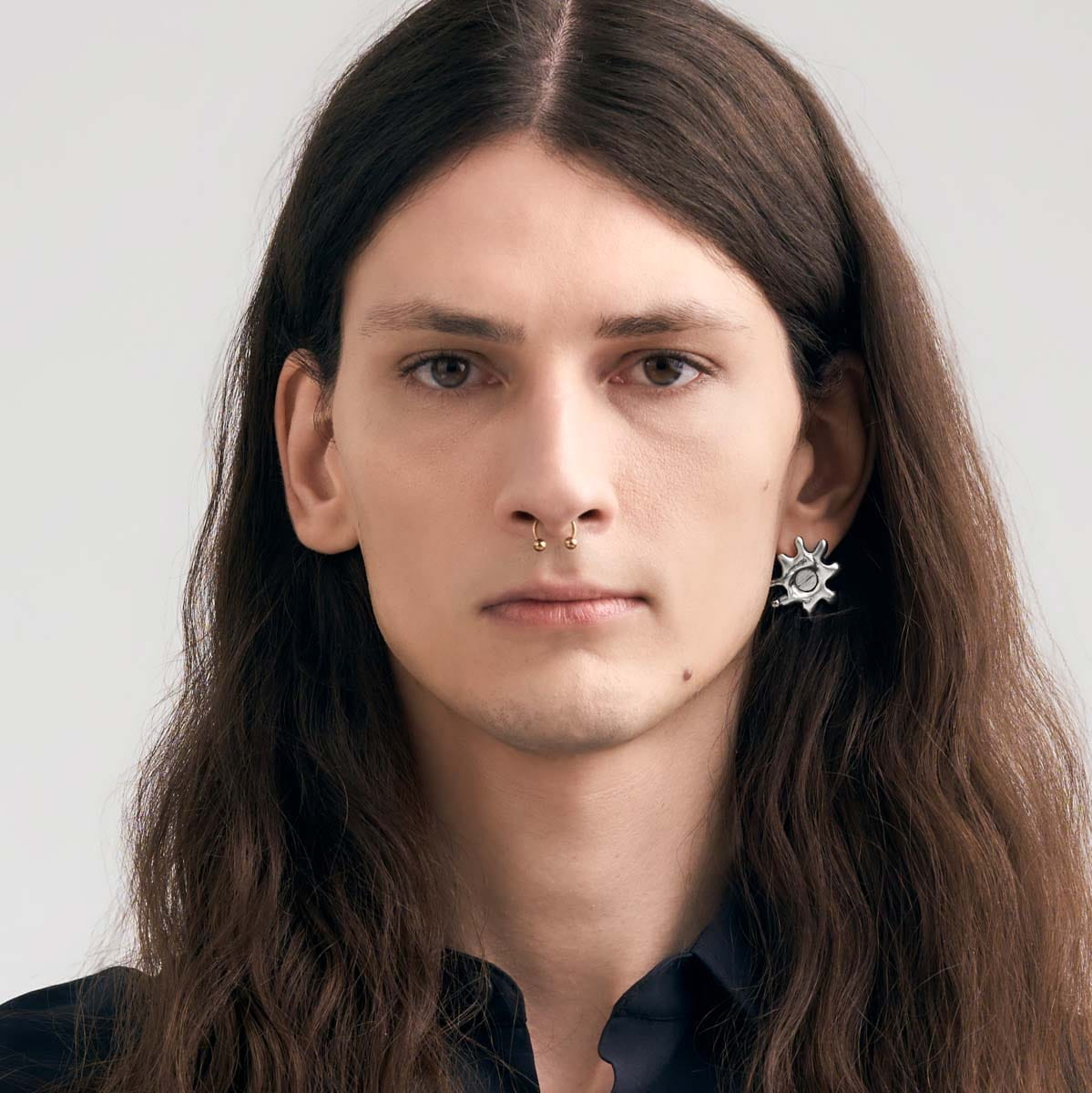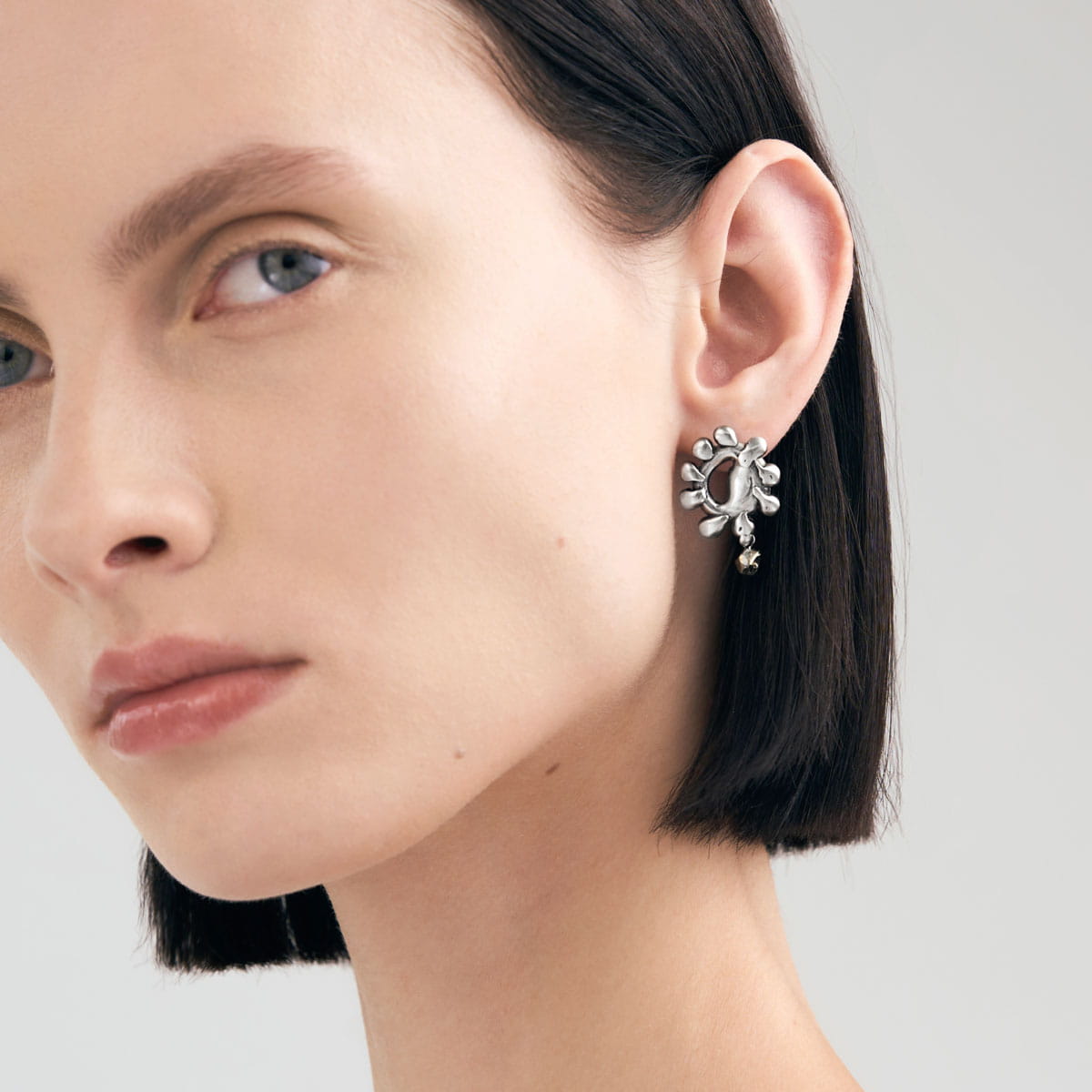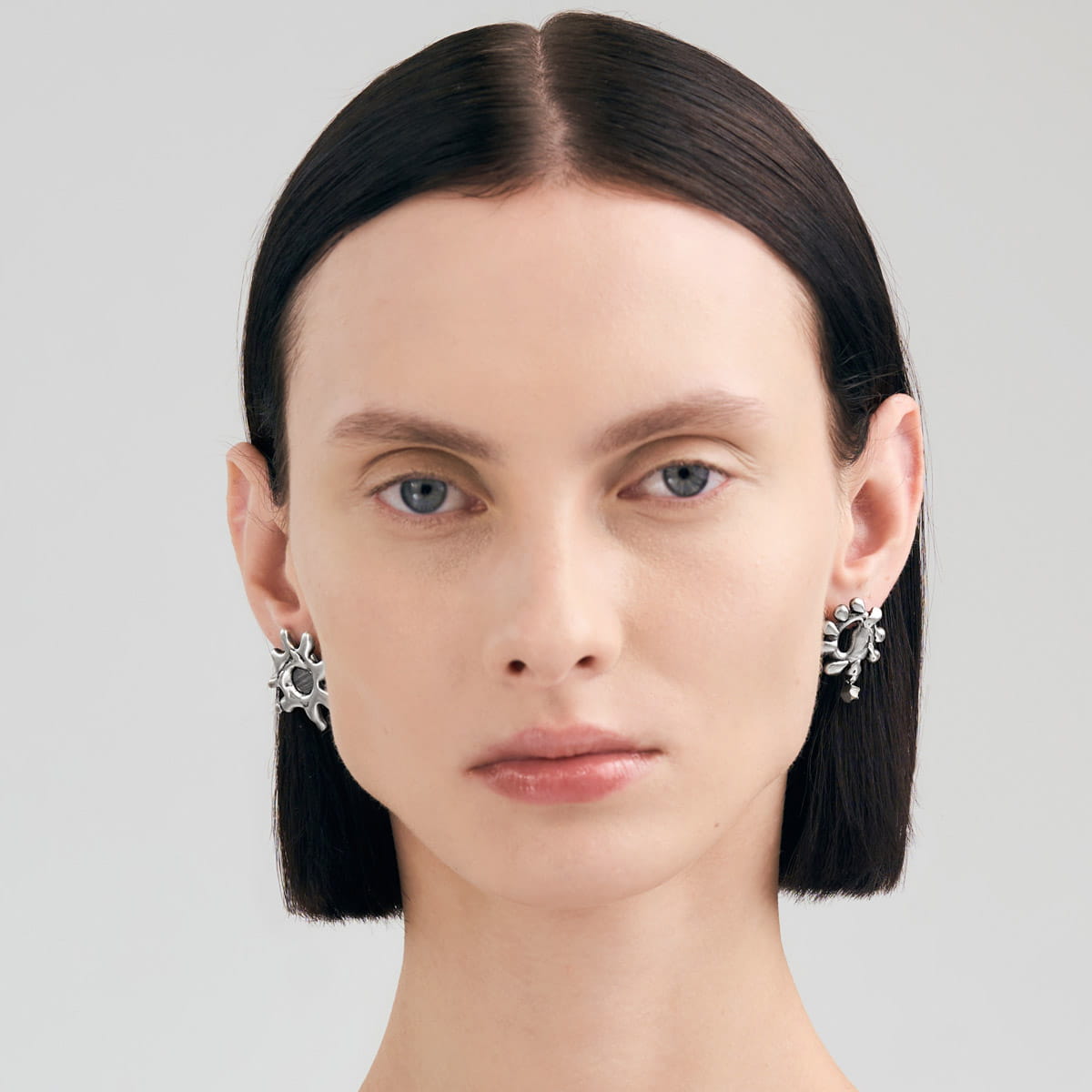 Kolczyki na sztyft z kolekcji Meteoros to połączenie najstarszego na naszej Planecie surowca i artystycznego kunsztu jubilerów ORSKA, które razem tworzą kompozycję inspirowaną niezmierzoną przestrzenią kosmosu. Kolczyki zostały wykonane ręcznie ze srebra próby 925. Dzięki metodzie lanego metalu kolczyki zyskały miękną, niemal płynną formę, która od razu przyciąga wzrok. Jeden z kolczyków ma kształt nieregularnej, rozgałęzionej formy, przypominającej eksplozję gwiezdnej materii, w którego centrum osadzono fragment meteorytu Aletai. Kamień jest okrągły, o naturalnej srebrzystej powierzchni i jodełkowej strukturze. Ujawniająca się po szlifowaniu meteorytu kompozycja zwana jest wzorem Widmanstaetena. Szaro-stalowa barwa meteorytu przenika się z błyszczącym srebrem otaczającej go oprawy. Drugi, asymetryczny kolczyk posiada nieregularną formę z wydłużonymi, zaokrąglonymi wypustkami i dodatkowo ozdobiony jest wiszącym, fasetowanym pirytem.