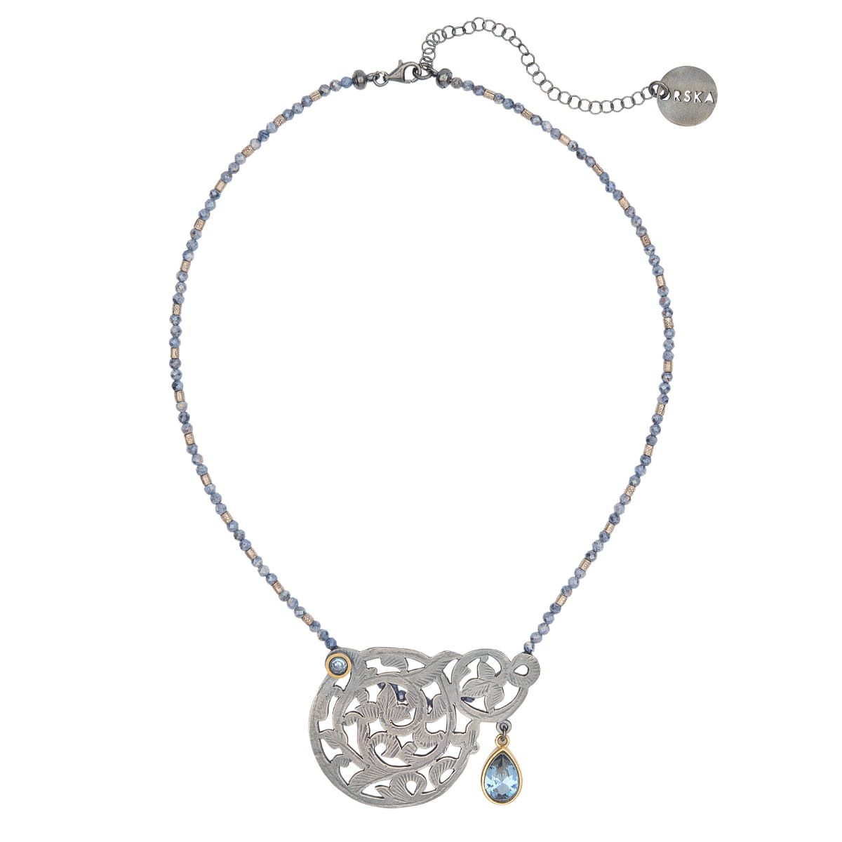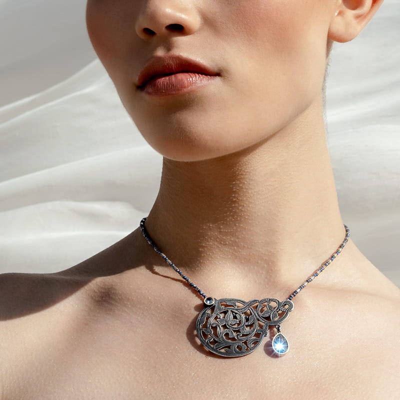 Krótki naszyjnik został wykonany ręcznie ze srebra w lokalnym, marokańskim warsztacie. Mistrzowie z Marrakeszu wycięli misterny wzór i nadali mu ażurową strukturę, a następnie pogłębili relief, by uwypuklić zdobienie. Chcą podkreślić grę światłocienia, w warsztacie ORSKA biżuteria została oksydowana. Okrągły wisior ozdobiony został dwoma niebieskimi cyrkoniami – mniejszą, okrągłą i większą, w kształcie łzy. Obydwie cyrkonie oprawione są w mosiężne ramy w kontrastującym z całością, złotym kolorze. Wisior zawieszony został na artystycznym naszyjniku, który utworzyły koralki srebra i galwanizowanego szafiru. Całość ozdobiona została okrągłym logiem ORSKA. Naszyjnik ma także funkcjonalna przedłużkę, dzięki której jego długość może być regulowana.