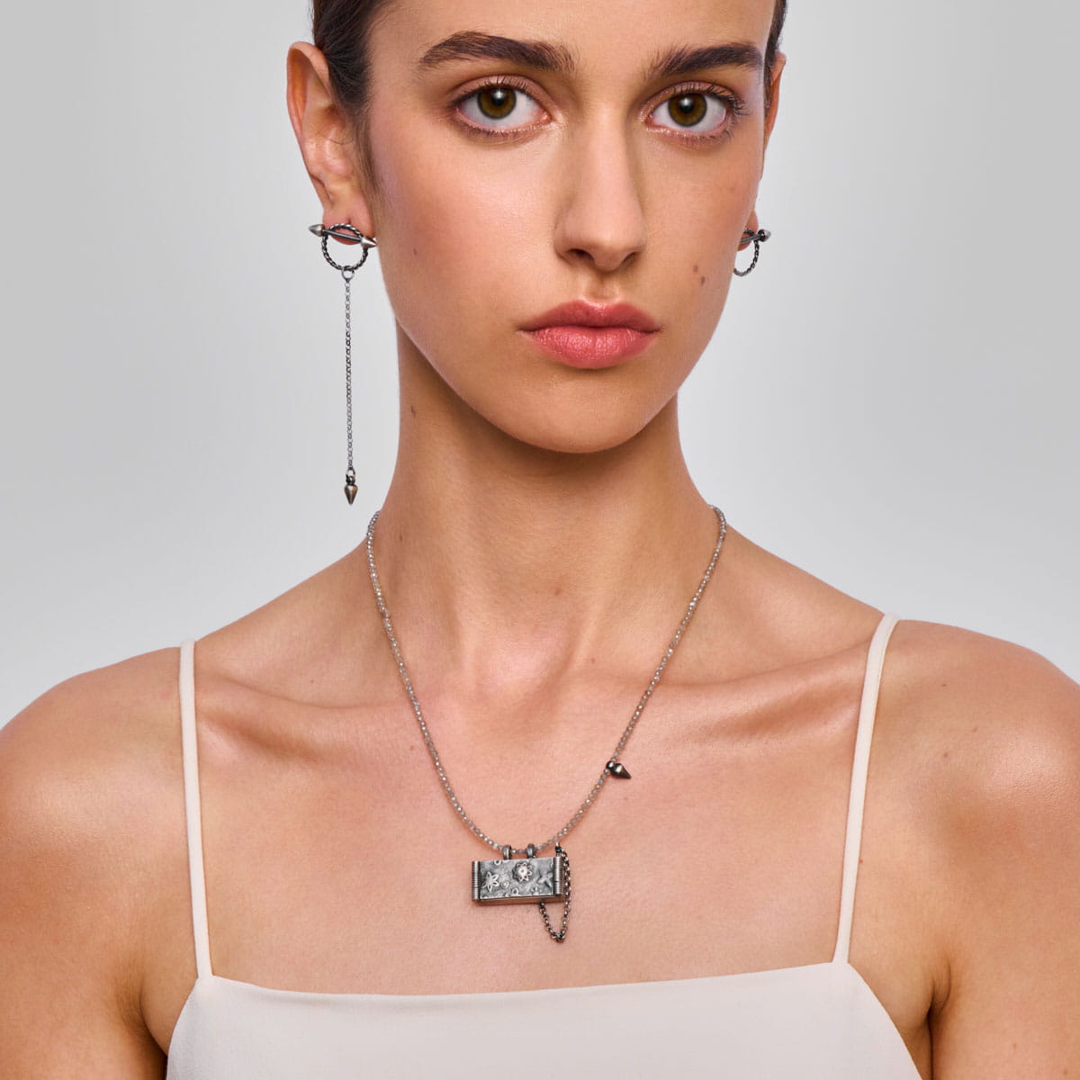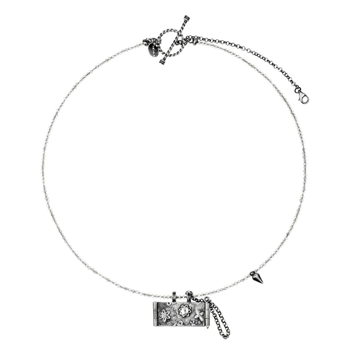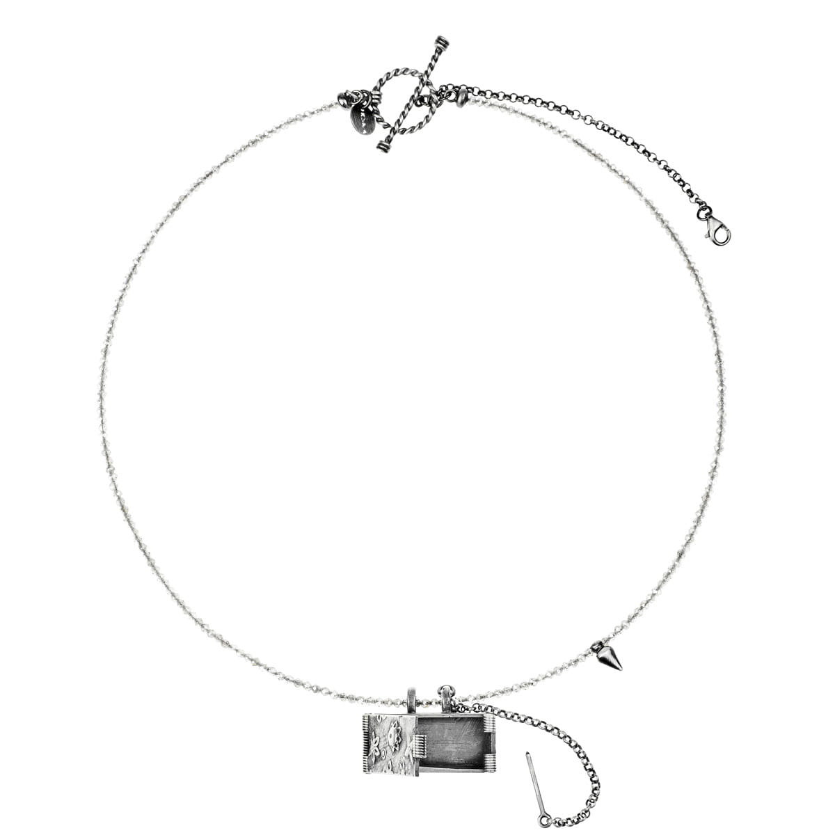 Naszyjnik wykonaliśmy ręcznie w pracowni jubilerskiej ORSKA. Na sznurze szarych drobnych labradorytów zawiesiliśmy wyjątkową zawieszkę wykonaną ze srebra próby 925. To otwierana amuletnica, czyli przestrzeń ukryta w biżuterii, w której możesz schować to, co dla Ciebie ważne: słowo, intencję, kamień, symbol. Jej forma nawiązuje do tradycyjnych medalionów, w których od wieków noszono relikwie, zioła, święte teksty lub inne miniaturowe, osobiste amulety. Amuletnica ma prostokątną formę, a jej powierzchnia ozdobiona jest geometrycznymi i roślinnymi ornamentami. Zamykana jest na drobną śrubkę i łańcuszek, który zabezpiecza ją przed zgubieniem. Naszyjnik dodatkowo udekorowany jest drobną zawieszką w kształcie grotu strzały. Całość zapinana jest na ozdobny skobelek o plecionej strukturze, który jest nie tylko wygodny, ale także efektowny.