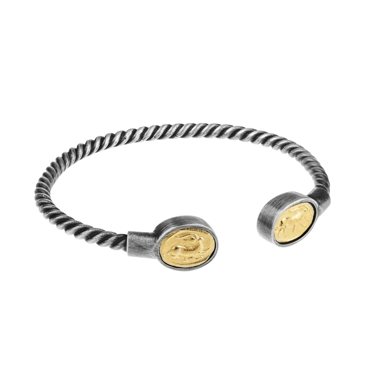 Sztywna, otwarta bransoletka została wykonana z oksydowanego srebra próby 925, które uformowaliśmy w spiralną strukturę. Zakończenia bransoletki wieńczą pozłacane fragmenty medalionów z wizerunkiem Koziorożca oprawione w kontrastujące srebrne ramy. Znak Koziorożca pojawia się zarówno w astrologii, jak i mitologii i ma duże znaczenie symboliczne, o którym możesz przeczytać poniżej. Bransoletka jest sztywną otwartą obręczą, która dzięki swojej formie pozwala na wygodne wsunięcie jej na nadgarstek. Bransoletki ORSKA są dostępne w rozmiarach odpowiednich dla nadgarstków od 14 cm do 23 cm. Na naszej stronie internetowej znajdziesz wskazówki, jak wybrać właściwy rozmiar bransoletki.