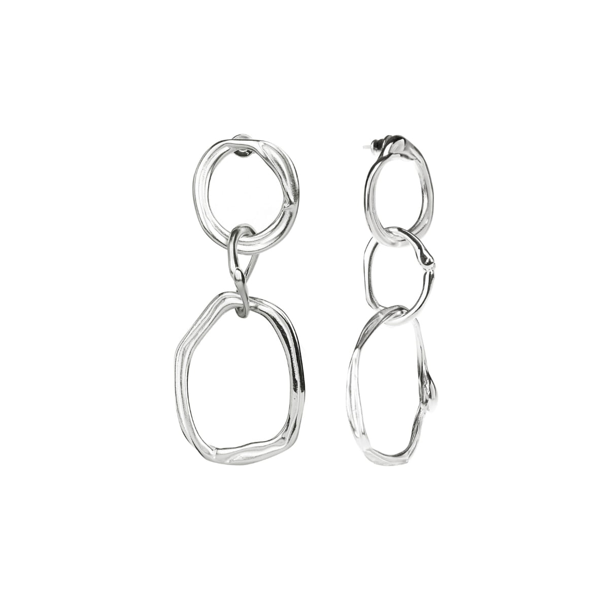 Asymetryczna para kolczyków powstała z okręgów o falowanych, płynnych krawędziach. Trzy połączone ze sobą ogniwa w różnych rozmiarach, tworzące każdy z kolczyków, wykonano z jasnego srebra polerowanego na wysoki połysk. Dzięki temu spokojnie falujące okręgi odbijają światło, rozświetlając okolice twarzy oraz szyi. Kolczyki sprawiają wrażenie stworzonych ze spływającego delikatnym strumieniem metalu. Taka forma budzi skojarzenia z wodą mórz i oceanów, do której zbyt często trafia nikomu już niepotrzebny plastik.
