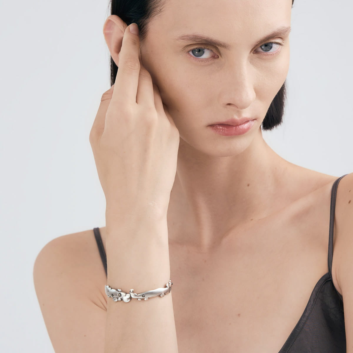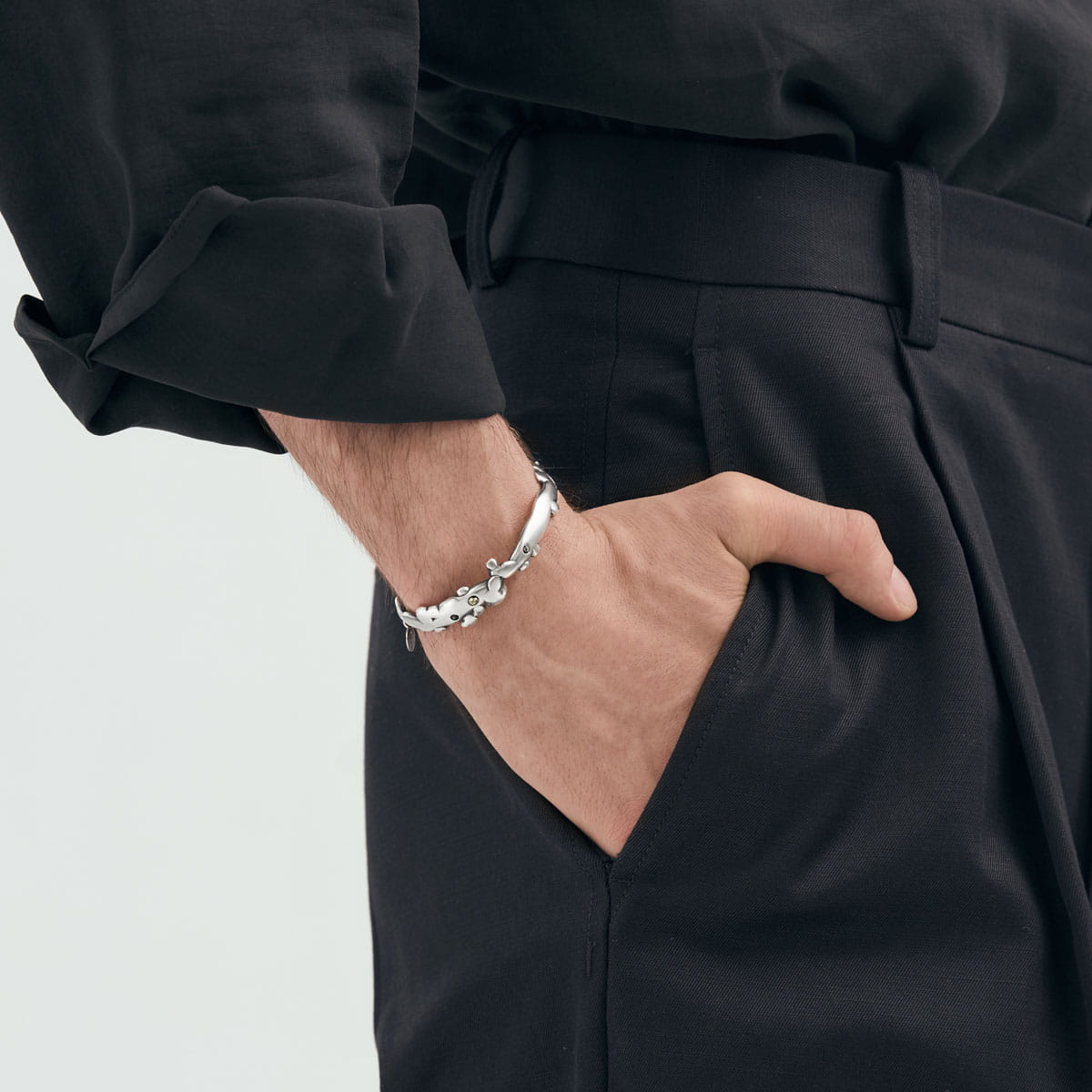 Ręcznie wykonana ze srebra próby 925 bransoletka z kolekcji Meteoros emanuje kosmicznym pięknem, łącząc w sobie artystyczny kunszt z najstarszym surowcem na naszej Planecie - meteorytem. Sztywna obręcz, zdobiona nieregularnymi formami powstałymi metodą lanego metalu, subtelnie owija się wokół nadgarstka, przywodząc na myśl kosmiczne kształty. Ozdobiona fragmentami meteorytu Aletai oraz pirytami, bransoletka zyskuje wyjątkowy, nieziemski charakter. Zawieszka z logo ORSKA subtelnie zamyka całą kompozycję. Bransoletka nie ma zapięcia, dzięki temu można ją łatwo wsunąć na nadgarstek.