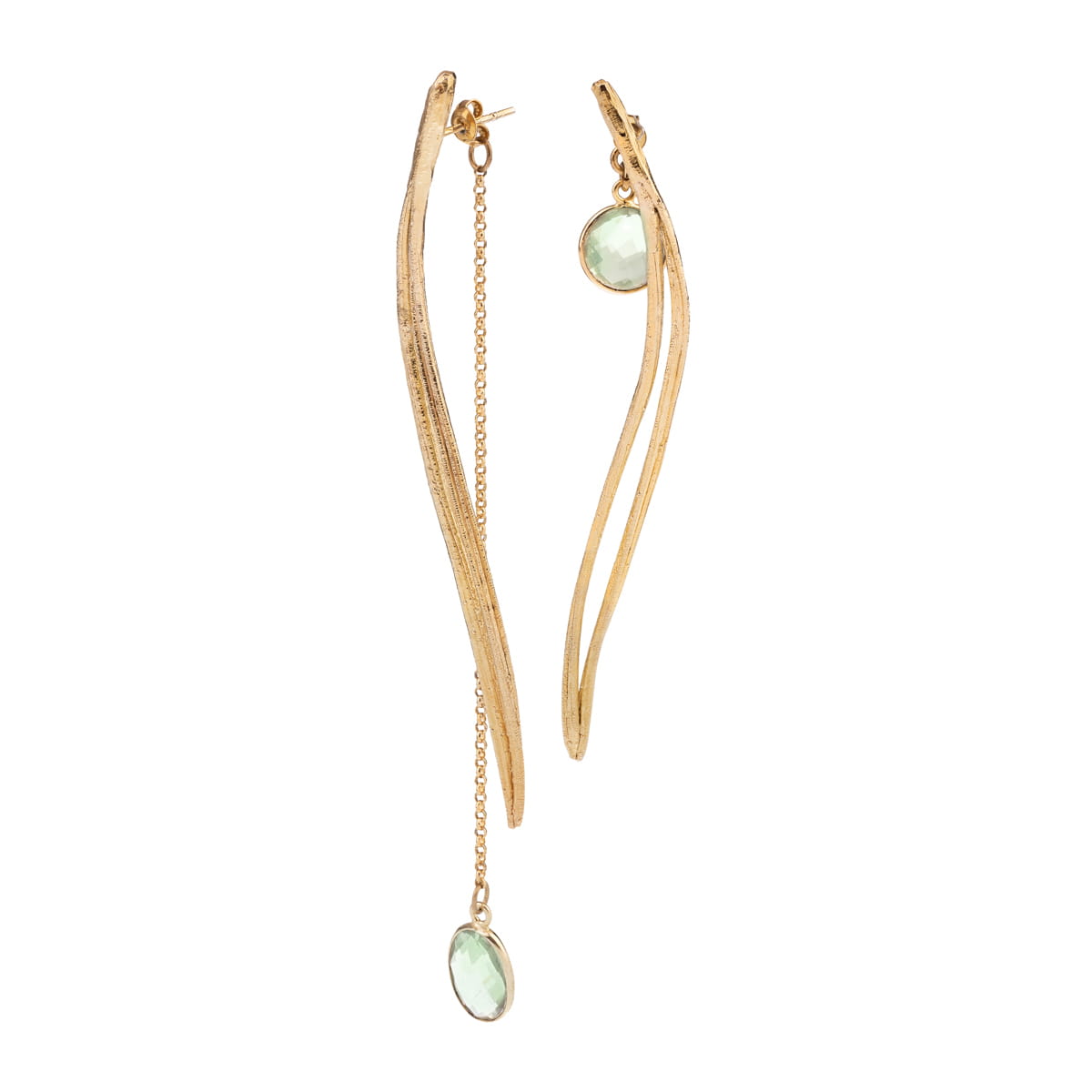 Biżuteria ORSKA jest wykonywana ręcznie w naszej poznańskiej pracowni, w której jubilerzy dbają o najmniejszy szczegół każdego egzemplarza biżuterii. Asymetryczne kolczyki składają się z odlanych z mosiądzu i pozłoconych form wzorowanych na igłach sosy, pokrytych złotem, umieszczonych na srebrnych sztyftach. Do srebrnych zatyczek przytwierdzono zielone akwamaryny w pozłacanej oprawie. Jeden kolczyk zdobi owalny kamień na delikatnym, długim łańcuszku ze srebra, a drugi krótki i okrągły topaz. Dzięki temu kolczyki zyskały ciekawy wygląd, a kamienie w oryginalny sposób wyłaniają się zza ucha. Złoty kolor współgra z zielonymi kamieniami, przywołując skojarzenia z morzem oświetlonym ciepłym blaskiem słońca. Kolczyki sprawdzą się u pań kochających niebanalną, artystyczną biżuterię. W kolekcji Bery można znaleźć również pasujący naszyjnik z igłami sosny, razem z którym kolczyki stworzą komplet przykuwający spojrzenia.