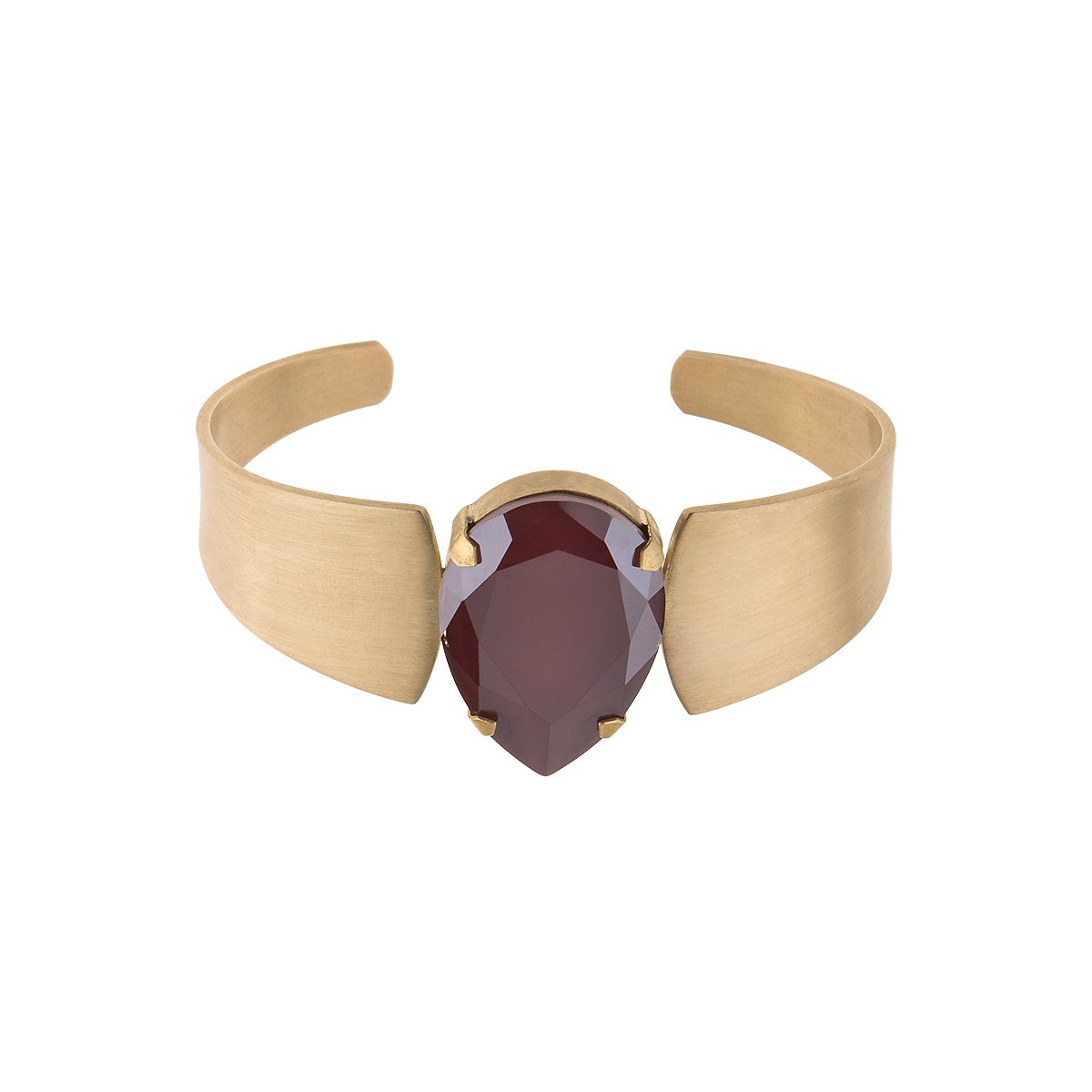 Kolekcja Frost powstała pod wpływem inspiracji pękającym lodem. Jego krystaliczna struktura sprawia, że podczas rozłamu powstają okruchy o migocących w świetle fasetach i ostrych krawędziach. Sztywna bransoletka została wykonana ręcznie i ozdobiona efektownym rubinowym kryształem Swarovski Elements o geometrycznym kształcie. Ciekawy design przyciąga uwagę. Bransoletka sprawdzi się jako główna ozdoba wieczorowych stylizacji.