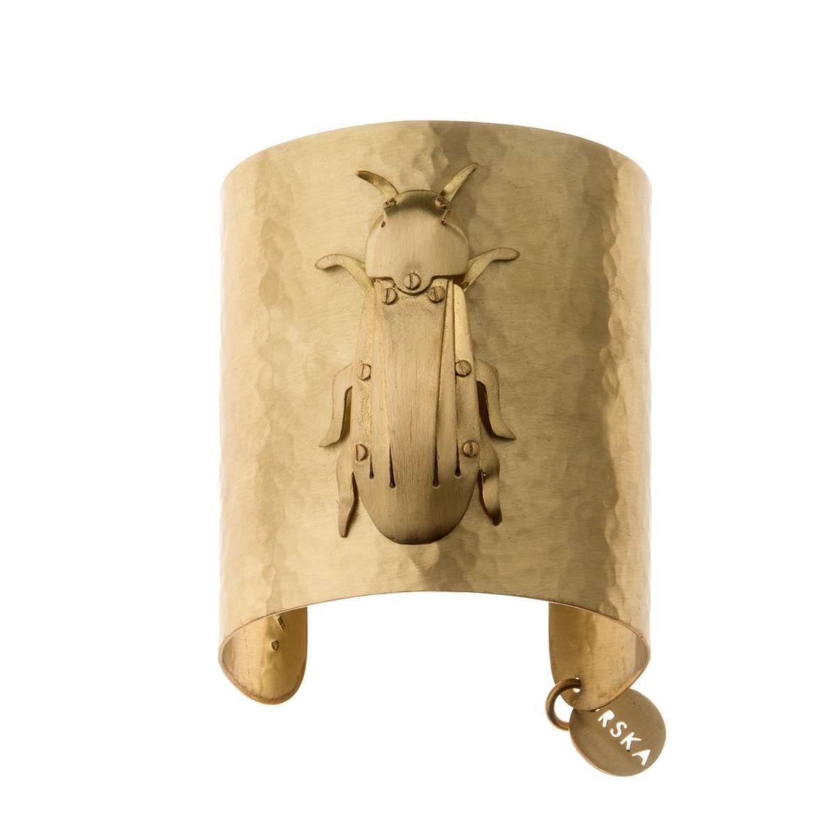 Sztywna, ręcznie wykonana bransoletka z kolekcji INSEKTY została zainspirowana bogactwem owadziego mikrokosmosu. Biżuteria wykonana wg projektów Anny Orskiej to kreatywny sposób na obrócenie negatywnych uczuć, jakie większość nas żywi wobec insektów, w fascynację i pożądanie. Szeroki mankiet wykonany został z mosiądzu o kutej fakturze, a następnie ozdobiony dekoracyjnym świetlikiem świętojańskim w stylu origami. Pancerz i czułki zostały wycięte z metalu i połączone zegarmistrzowskimi śrubkami.