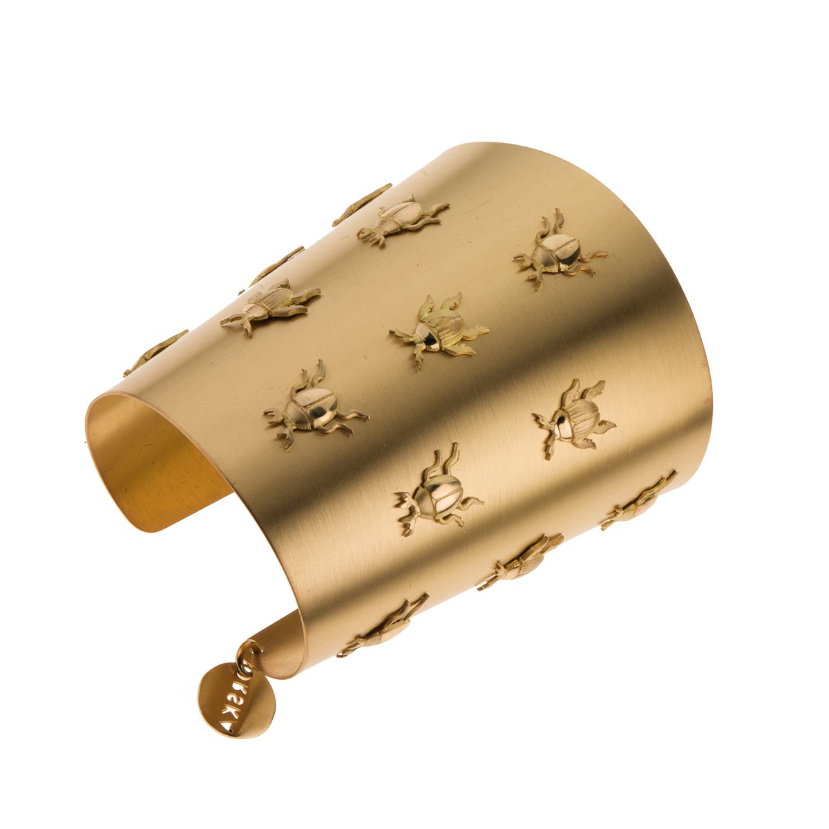 Sztywna, ręcznie wykonana bransoletka z kolekcji INSEKTY została zainspirowana bogactwem owadziego mikrokosmosu. Biżuteria wykonana wg projektów Anny Orskiej to kreatywny sposób na obrócenie negatywnych uczuć, jakie większość nas żywi wobec insektów, w fascynację i pożądanie. Szeroki mankiet wykonany został z mosiądzu o satynowym wykończeniu, a następnie ozdobiony licznymi elementami dekoracyjnymi w kształcie żuków. Pancerze i czułki niektórych z nich wykończone zostały na wysoki połysk. Odlane w metalu żuki mieniąc się złotym odcieniem odbijają światło i sprawiają, że trudno oderwać od nich wzrok.