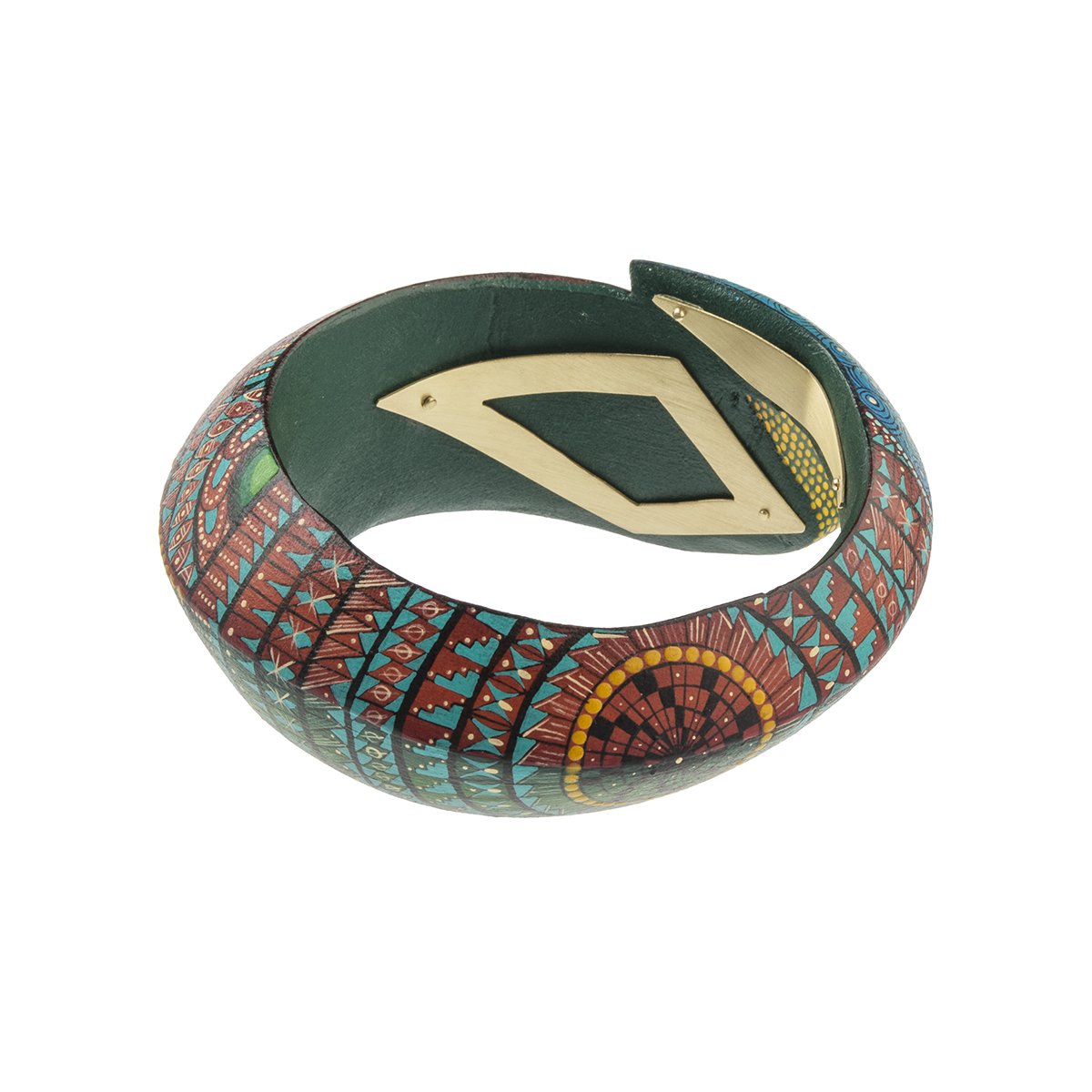 Sztywna bransoletka inspirowana alebrijes - meksykańskimi rzeźbami wykonanymi z drewna kopalowego, ręcznie malowanymi w niebywale kolorowe, geometryczne wzory. Bransoletka typu bangle została wyrzeźbiona z jednego kawałka drewna i ozdobiona symbolami zaczerpniętymi z kultury Zapoteków. Drewniana obręcz została uzupełniona mosiężnymi elementami oraz dyskretnym logo ORSKA. Bransoletka jest unikatowa, podobnie jak pozostała biżuteria z kolekcji Meksyk.