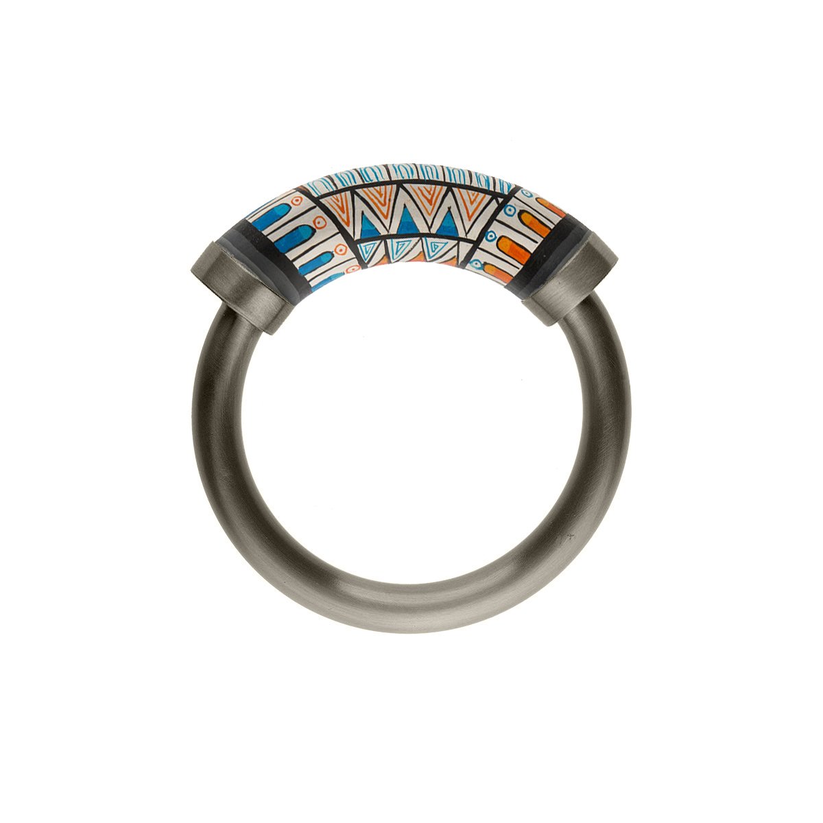 Sztywna mosiężna bransoletka z dekoracyjnym elementem inspirowanym alebrijes - meksykańskimi rzeźbami wykonanymi z drewna kopalowego, ręcznie malowanymi w niebywale kolorowe, geometryczne wzory. Rzeźba w odcieniach bieli, pomarańczu i kobaltu została oprawiona w oksydowany mosiądz. Bransoletka jest unikatowa, podobnie jak pozostała biżuteria z kolekcji Meksyk.