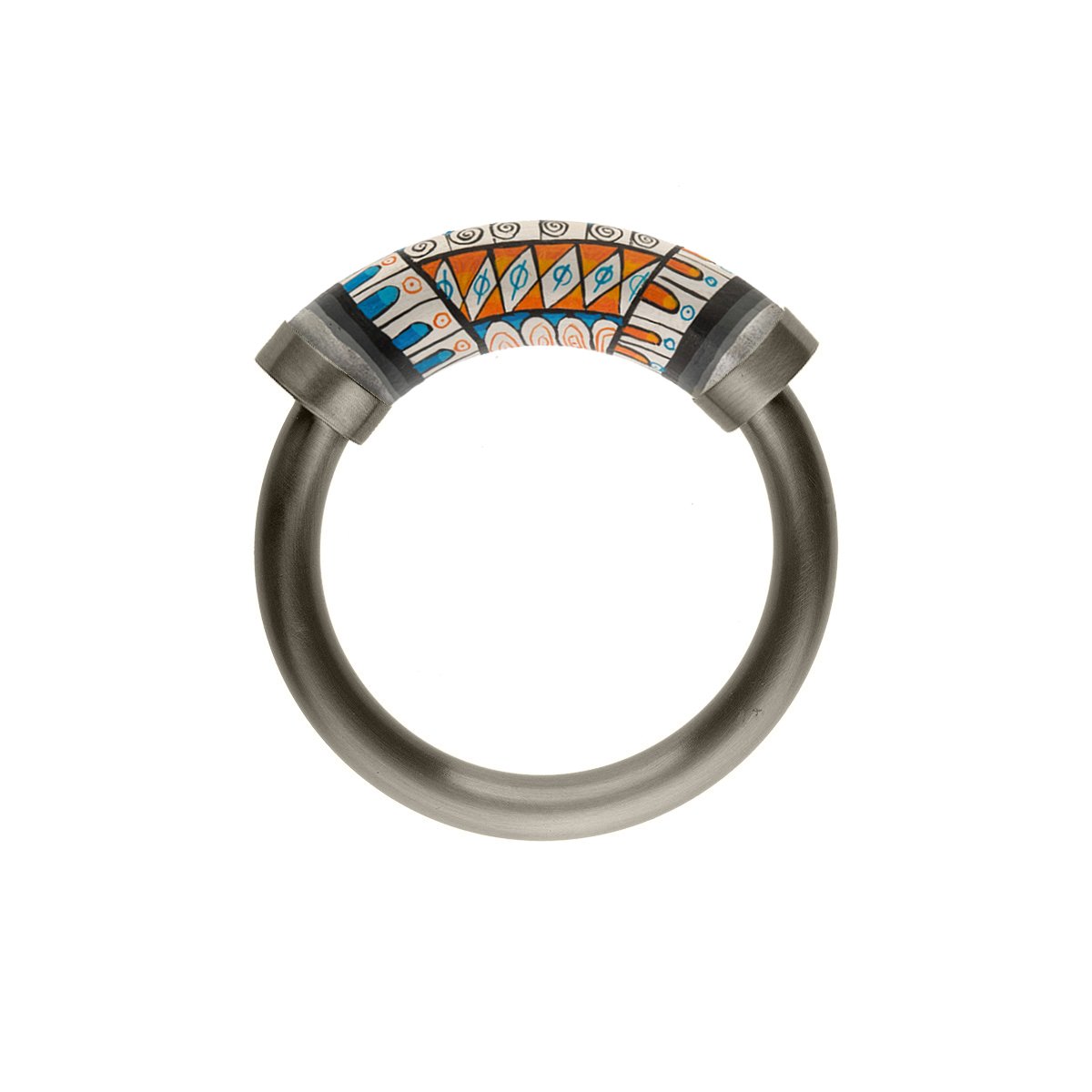 Sztywna mosiężna bransoletka z dekoracyjnym elementem inspirowanym alebrijes - meksykańskimi rzeźbami wykonanymi z drewna kopalowego, ręcznie malowanymi w niebywale kolorowe, geometryczne wzory. Rzeźba w odcieniach bieli, pomarańczu i kobaltu została oprawiona w oksydowany mosiądz. Bransoletka jest unikatowa, podobnie jak pozostała biżuteria z kolekcji Meksyk.