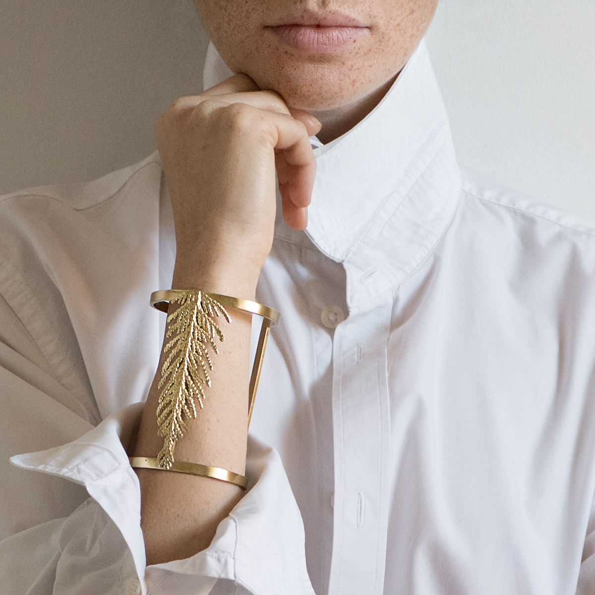 Codzienna, bliska obecność żywotnika zachodniego i jego nieoczywista doskonałość zainspirowały Annę Orską do stworzenia kolekcji Thuja, która dzięki naturalnemu designowi efektownie zdobi ciało. Delikatne pędy tui, zatopione w mosiądzu lub spatynowane srebrem, dodają lekkości artystycznej, sztywnej bransoletce. Szeroki mankiet przyciąga spojrzenia skupiając na sobie całą uwagę. Nowoczesna, kobieca biżuteria z organicznym motywem będzie idealnym wyborem dla osób kochających naturę, które nieustannie czerpią z niej siłę i radość.