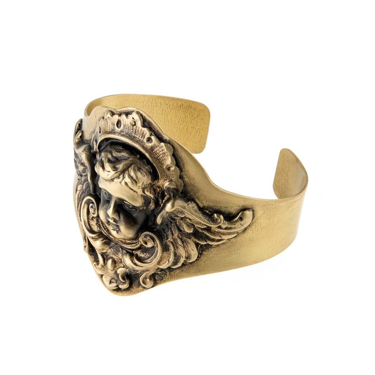Anna Orska doceniając urodę pozornie niepotrzebnych przedmiotów, tchnęła w nie drugie życie i uczyniła centralną częścią kolekcji Vintage. W ten sposób zaakcentowała znaczenie korzeni. Projektantka wykorzystała przedwojenne mechanizmy zegarowe, fragmenty okuć i mosiężnego rękodzieła i ubrała je we współczesne minimalistyczne formy. Artystyczna, sztywna bransoletka została wykonana ręcznie. W mosiężny mankiet o satynowym wykończeniu wkomponowano figurę anioła. Dzięki syntezie nowoczesnej, minimalistycznej formy i wiekowych elementów, mocno osadzonych w historii, oryginalna biżuteria stanowi swoisty symbol, który przypomni, o tym co pozostało za nami. Efektowny wzór podkreśli odważny charakter nietuzinkowych właścicielek.