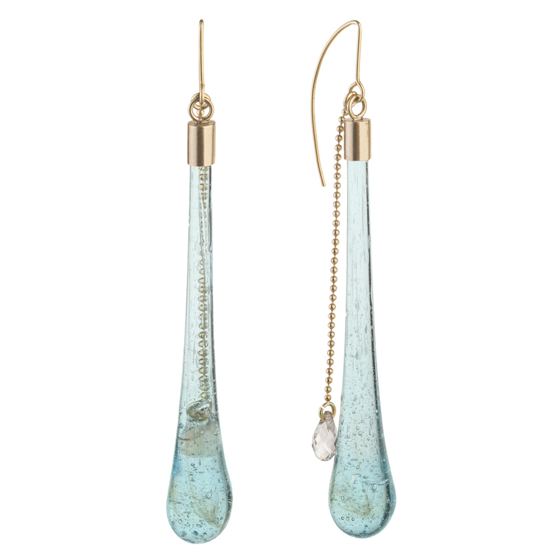 Smukłe krople z kolekcji Frost wykonane zostały z pozostałości masy szklanej, która oddzieliła się w procesie wydmuchiwania większych naczyń. Elementy starannie zebrane na jednym z kairskich targowisk zazwyczaj dekorują egipskie żyrandole i świeczniki, w projektach ORSKA utworzyły eleganckie zawieszki, które ozdobiły artystyczne bigle. Wiszące kolczyki dodatkowo udekorowane zostały kulkowym łańcuszkiem, który zakończony jest owalnym kryształem Swarovski Elements. Kolczyki z limitowanej serii została wykonana ręcznie.