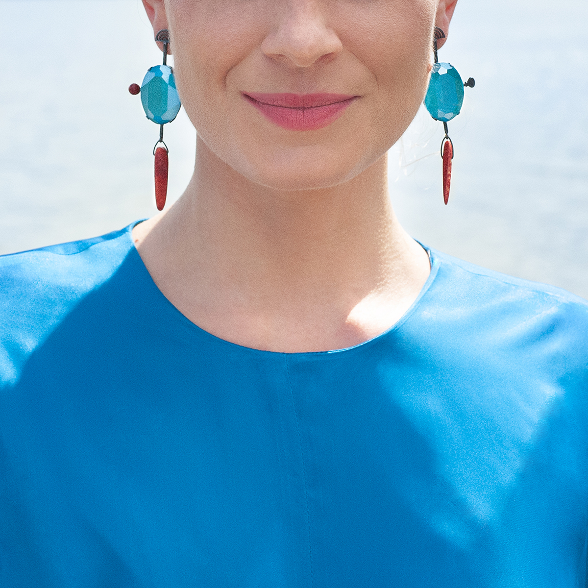 Kolekcja Gelato powstała dzięki spontanicznemu połączeniu barwnych minerałów, z drobnymi zawieszkami o geometrycznych kształtach i nieregularnych fakturach. Uwodzicielski zestaw drobnych ozdób utworzył linię lekkich projektów z nutką boho, które trafią prosto w serce wszystkich miłośniczek wolności i przestrzeni, tak nam bliskich w te długie, ciepłe dni. Ekspresyjne, wiszące kolczyki na sztyft doskonale ozdobią letnią sukienkę lub damski garnitur.