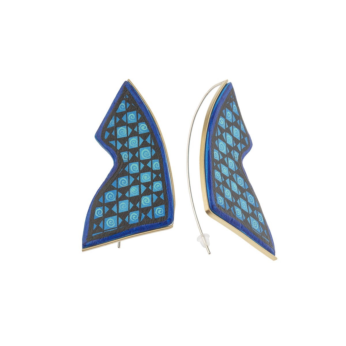 Biżuteria inspirowana alebrijes - meksykańskimi rzeźbami wykonanymi z drewna kopalowego, ręcznie malowanymi w niebywale kolorowe, geometryczne wzory. Artystyczne kolczyki inspirowane skrzydłami motyla monarchy - meksykańskiego symbolu szczęścia, są zaskakująco lekkie. Ozdobione drobnymi wzorami inspirowanymi symbolami zaczerpniętymi z kultury Zapoteków rzeźby zostały ujęte w delikatną mosiężną oprawkę zakończoną u góry srebrnym biglem.