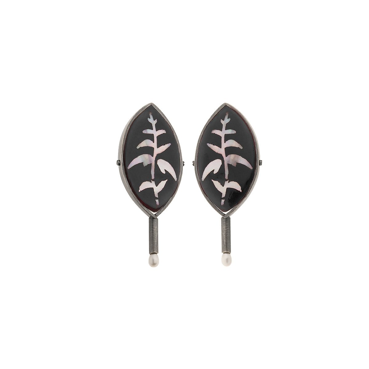 Proste, wyraziste kolczyki zostały zaprojektowane pod wpływem inspiracji Anny Orskiej podróżą do Wietnamu. Minimalistyczne wzornictwo uzupełnione elementami wietnamskiego rękodzieła ukazują współczesną interpretację azjatyckiej sztuki według projektantki. Czarne, owalne elementy zostały zrobione ręcznie przez rzemieślników w Wietnamie techniką lakowania, której korzenie sięgają sześciu tysięcy lat. Lakowane komponenty o wysokim połysku są inkrustowane roślinnymi wzorami, ręcznie wycinanymi z masy perłowej. U spodu kolczyków została osadzona srebrna rurka zakończona delikatną perełką słodkowodną. Oryginalny design świetnie sprawdzi się jako dodatek do powłóczystej sukni jak i luźnej tuniki.