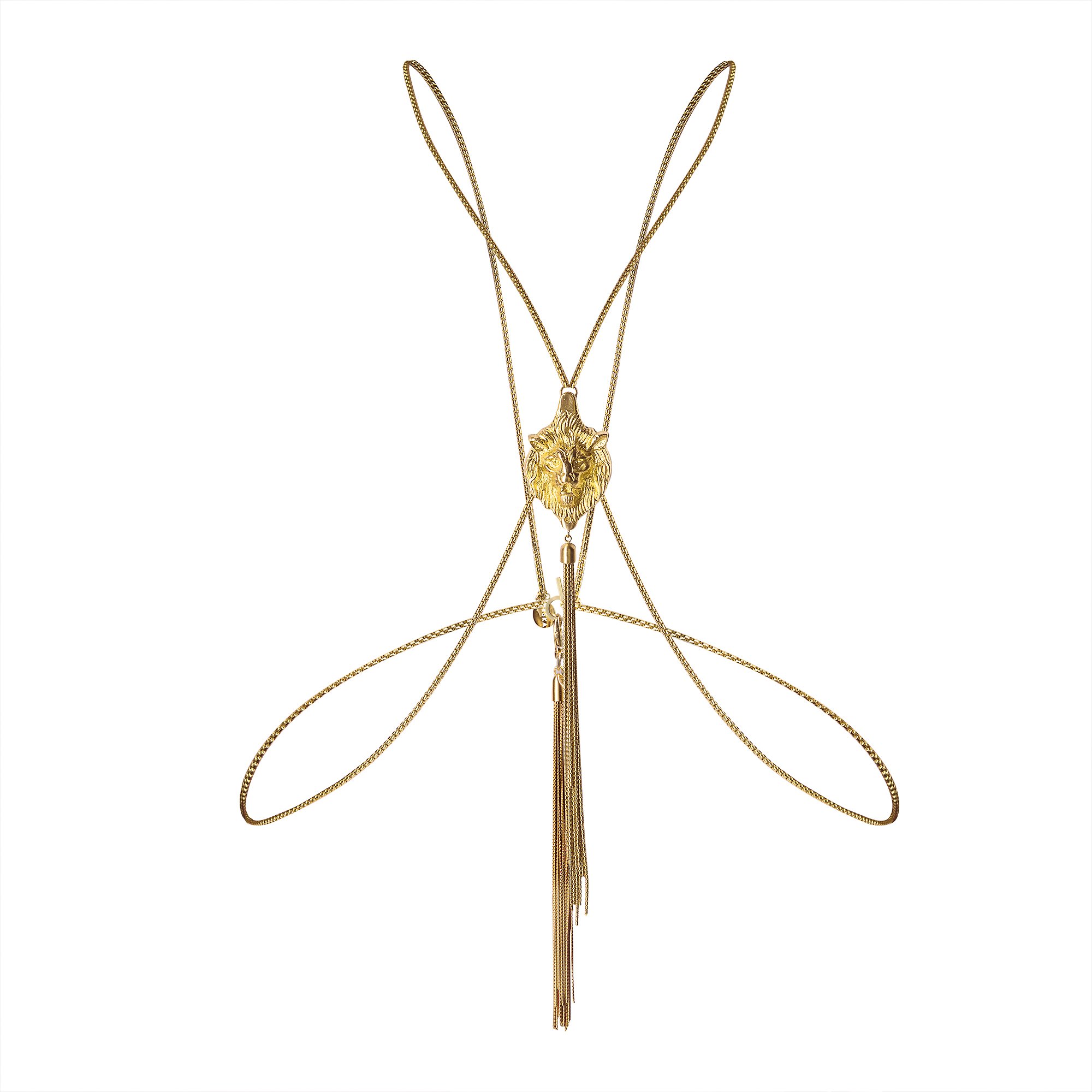 Body Chain to propozycja dla kobiet, które swoim wyglądem lubią stawiać deklaracje. Łańcuchy można nosić na wiele sposobów, coś co przed chwilą było naszyjnikiem, w kilka sekund może stać się masywną bransoletą, awangardowym paskiem albo potężną kolią. Można go owinąć wokół pasa, podkreślić nim talię lub przyczepić zawieszki z różnych kolekcji ORSKA. Body Chain został stworzony po to, by interpretować go w indywidualny sposób, by mógł dopasować się do każdego stylu i każdej sylwetki. Łańcuch z kolekcji Vintage został przyozdobiony głową lwa oraz mosiężnymi frędzelkami, które przełamują charakterny, trochę rockowy styl. Idealny statement piece.