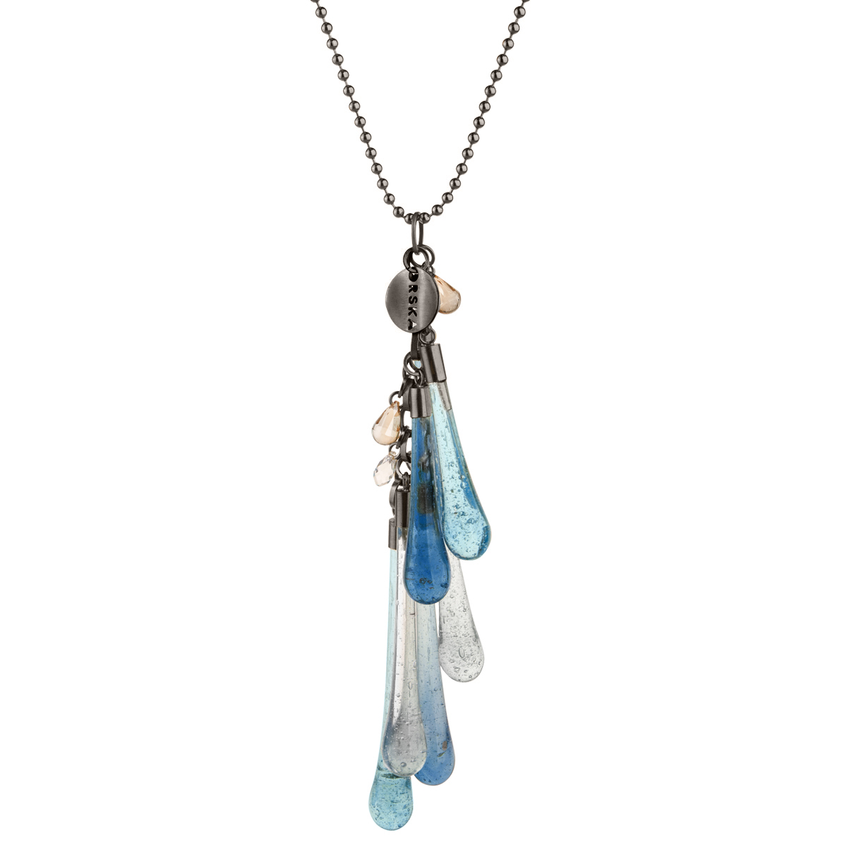 Smukłe, niebieskie krople z kolekcji Frost wykonane zostały z pozostałości masy szklanej, która oddzieliła się w procesie wydmuchiwania większych naczyń. Elementy starannie zebrane na jednym z kairskich targowisk zazwyczaj dekorują egipskie żyrandole i świeczniki, w projektach ORSKA stworzyły efektowny wisior. Oryginalny naszyjnik dodatkowo zdobią kryształy Swarovski Elements. Artystyczna biżuteria z limitowanej serii została wykonana ręcznie.