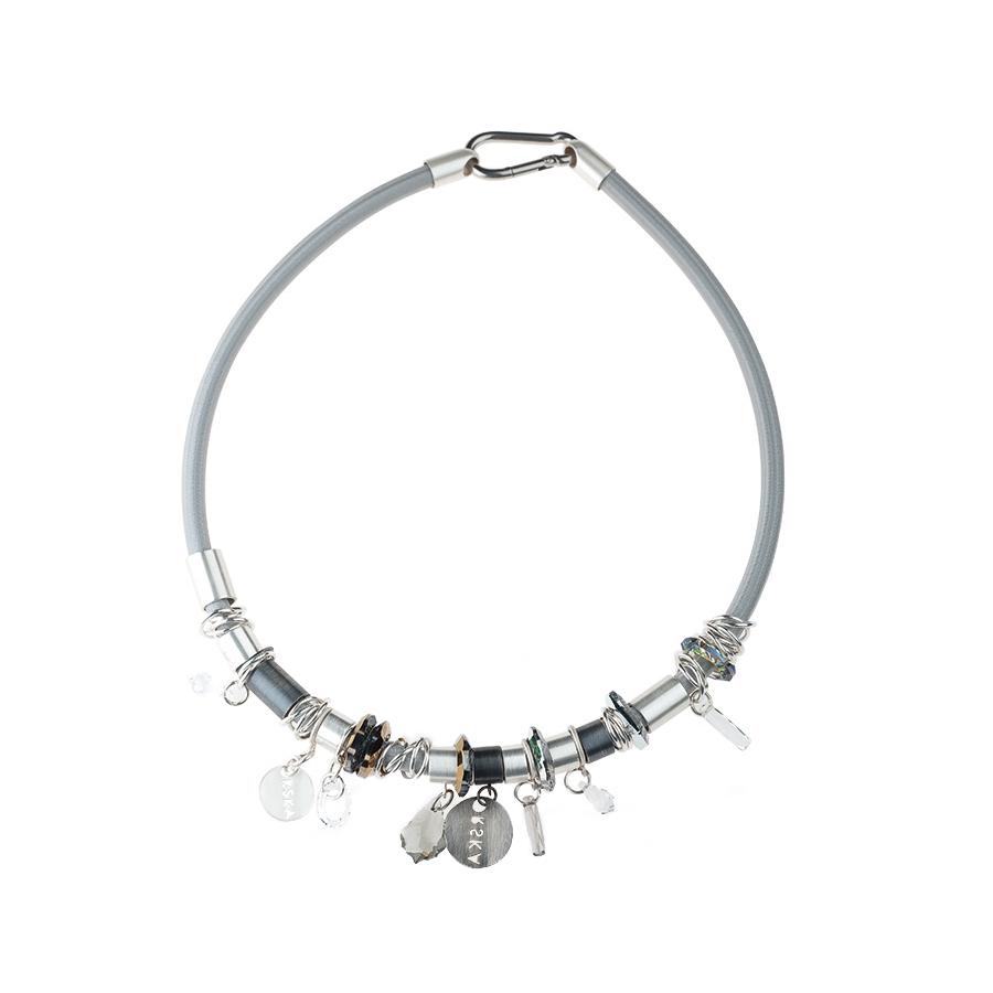 Kolekcja Frost powstała pod wpływem inspiracji pękającym lodem. Jego krystaliczna struktura sprawia, że podczas rozłamu powstają okruchy o migocących w świetle fasetach i ostrych krawędziach. Krótki naszyjnik jest wykonywany ręcznie z szarej lub czarnej liny żeglarskiej i zdobiony licznymi mosiężnymi tubami, ogniwami i kryształami Swarovski Elements. Idealnie ozdobi klasyczną czarną sukienkę lub prosty, damski garnitur.