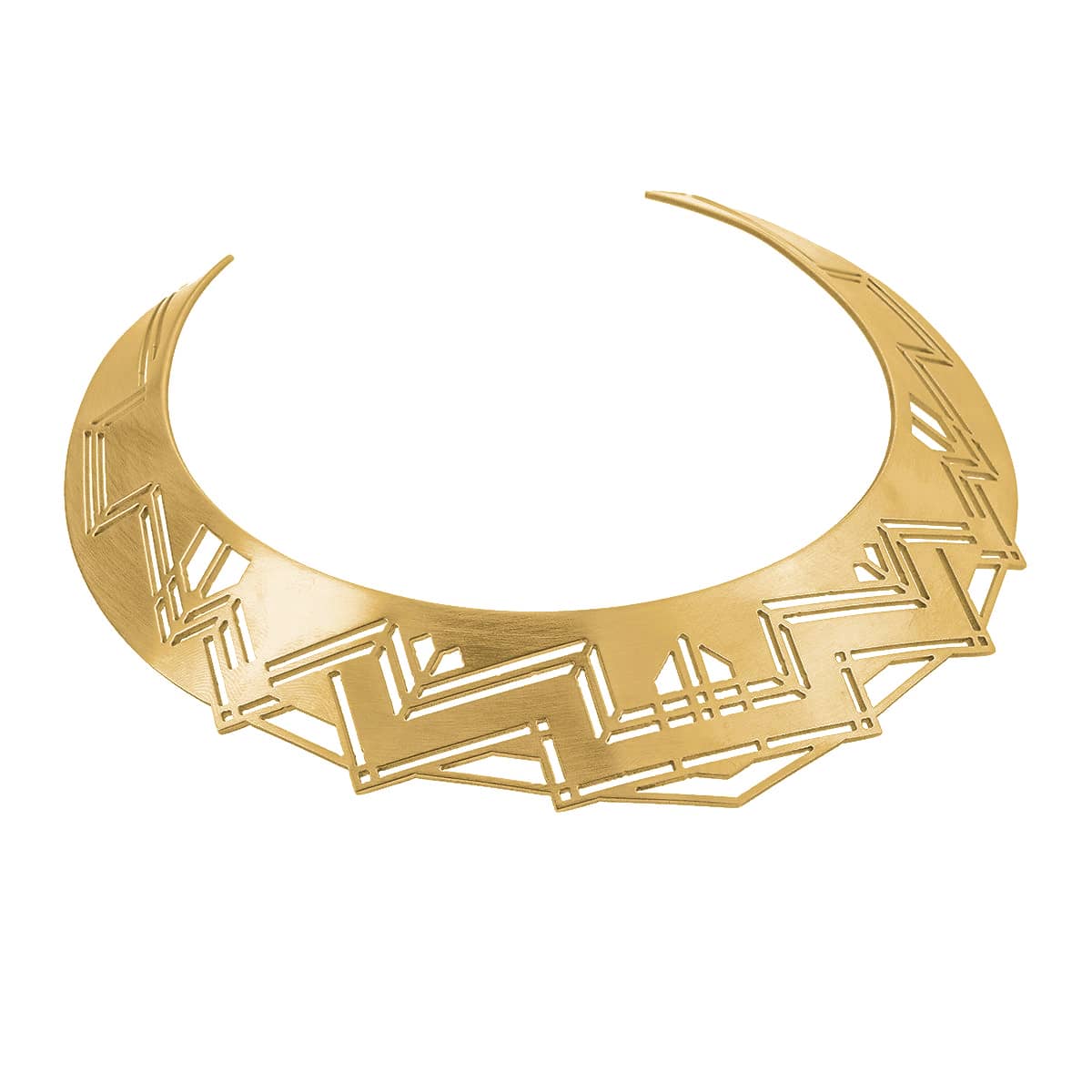 Ażurowa, sztywna kolia w geometryczna kształcie została ręcznie wykonana z alpaki lub mosiądzu. Projekt syntetyzuje entuzjazm dla wybitnych artystycznych stylów minionych czasów oraz estetyki współczesnego przemysłu technologicznego. Na podobieństwo stylu art déco, łączy perfekcyjne wykonanie, uznanie dla eleganckiej sztuki, z projektowaniem na potrzeby współczesności. Minimalistyczna lecz wyrazista konstrukcja sprawia, że będzie on świetnym dodatkiem do monochromatycznych strojów o prostym kroju. Biżuteria jest na tyle wyrazista, że może stanowić samodzielny dodatek, jednak bardzo dobrze sprawdzi się również w zestawieniu z kolczykami z kolekcji Nano.