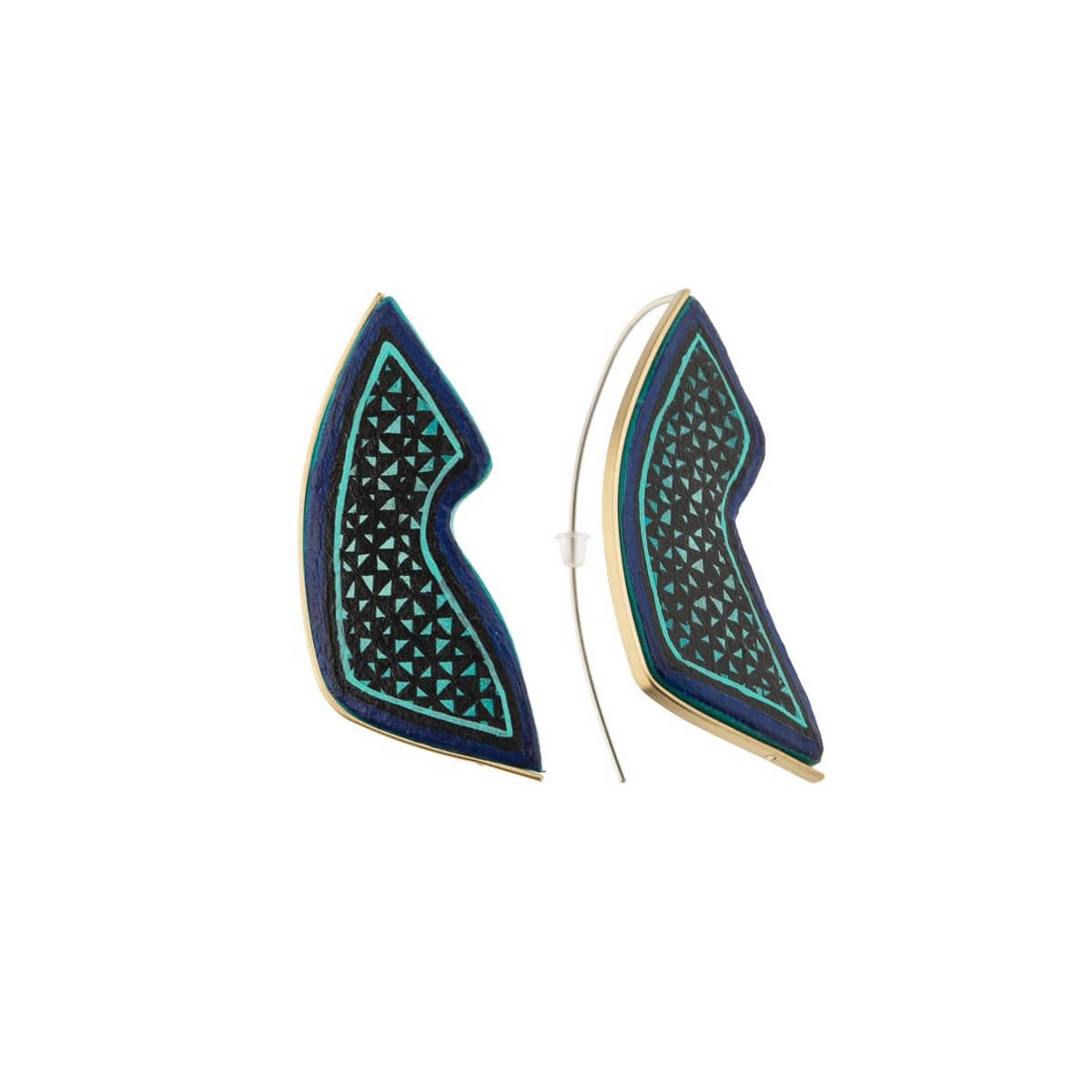 Biżuteria inspirowana alebrijes - meksykańskimi rzeźbami wykonanymi z drewna kopalowego, ręcznie malowanymi w niebywale kolorowe, geometryczne wzory. Artystyczne kolczyki skrzydła motyla monarchy - meksykańskiego symbolu szczęścia, są zaskakująco lekkie. Ozdobione symbolami zaczerpniętymi z kultury Zapoteków rzeźby zostały ujęte w delikatną mosiężną oprawkę zakończoną u góry srebrnym biglem.