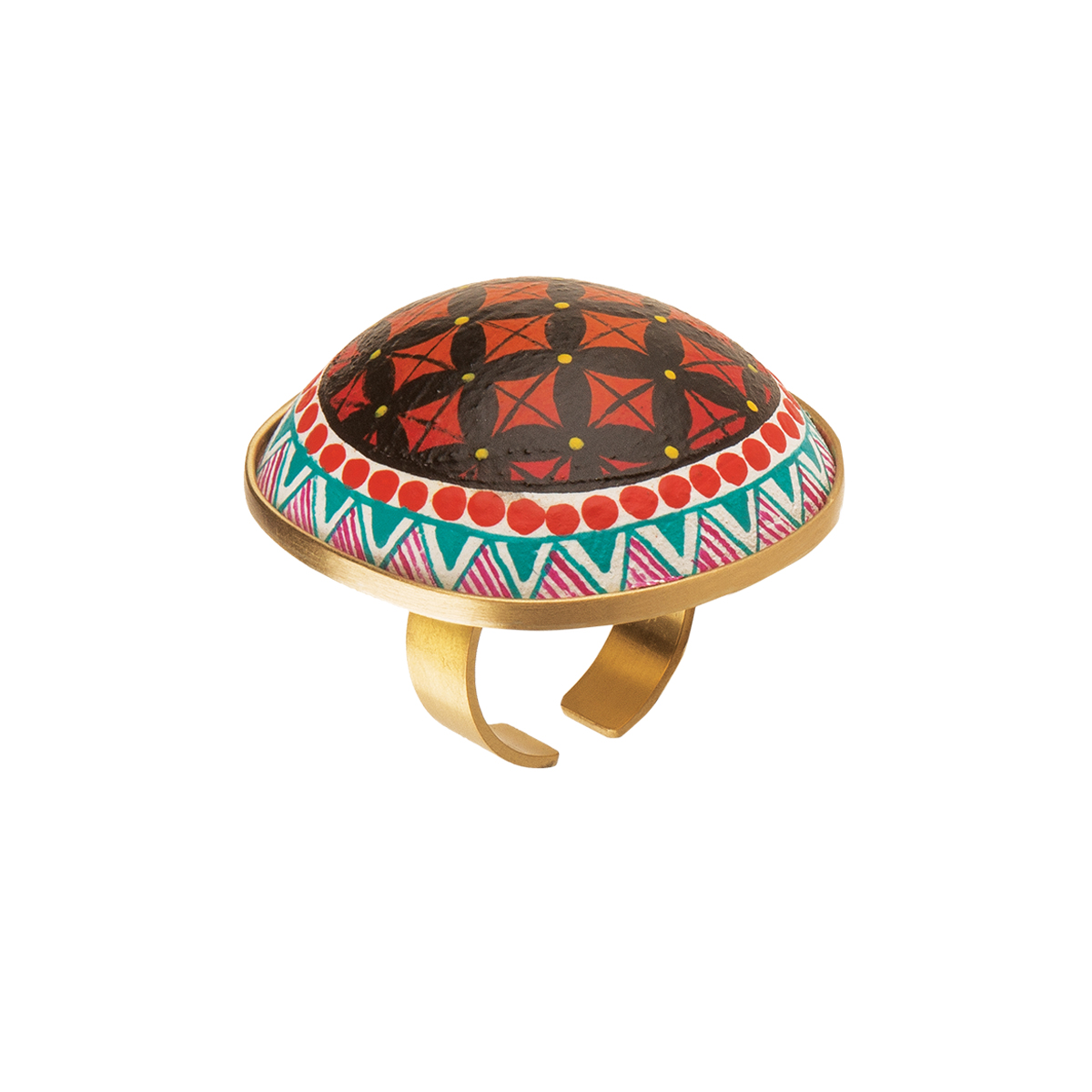 Autorska biżuteria inspirowana alebrijes - meksykańskimi rzeźbami wykonanymi z drewna kopalowego, ręcznie malowanymi w niebywale kolorowe, geometryczne wzory. Artystyczny pierścionek w okrągłym kształcie został wyrzeźbiony z drewna kopalowego i pomalowany ręcznie w drobne wzory inspirowane symbolami Zapoteków. Unikatowa rzeźba została oprawiona w delikatną ramkę z mosiądzu.