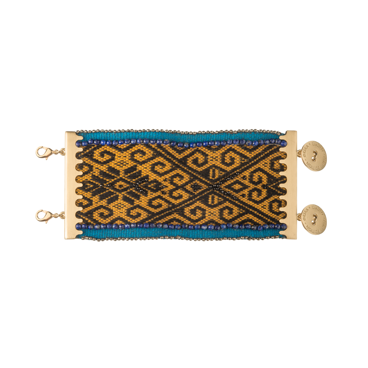 Biżuteria z kolekcji Peru to połączenie kilku form misternego rękodzieła: tkactwa, jubilerstwa i haftu koralikowego. Jej historia rozpoczyna się na peruwiańskich wyżynach gdzie tkanie jest żywą sztuką. Unikatowa tkanina zyskała szlachetności dzięki haftowi koralikowemu z wykorzystaniem kamieni naturalnych. Całości dopełnia ręcznie wykonana oprawa zapinana na mosiężne guziki. Pod spodem bransoletki ukryty jest grawer informujący o peruwiańskim pochodzeniu biżuterii. Nosząc biżuterię utkaną na peruwiańskich wyżynach możesz kontynuować historię zbudowaną na wątkach innych miejsc i kultur.