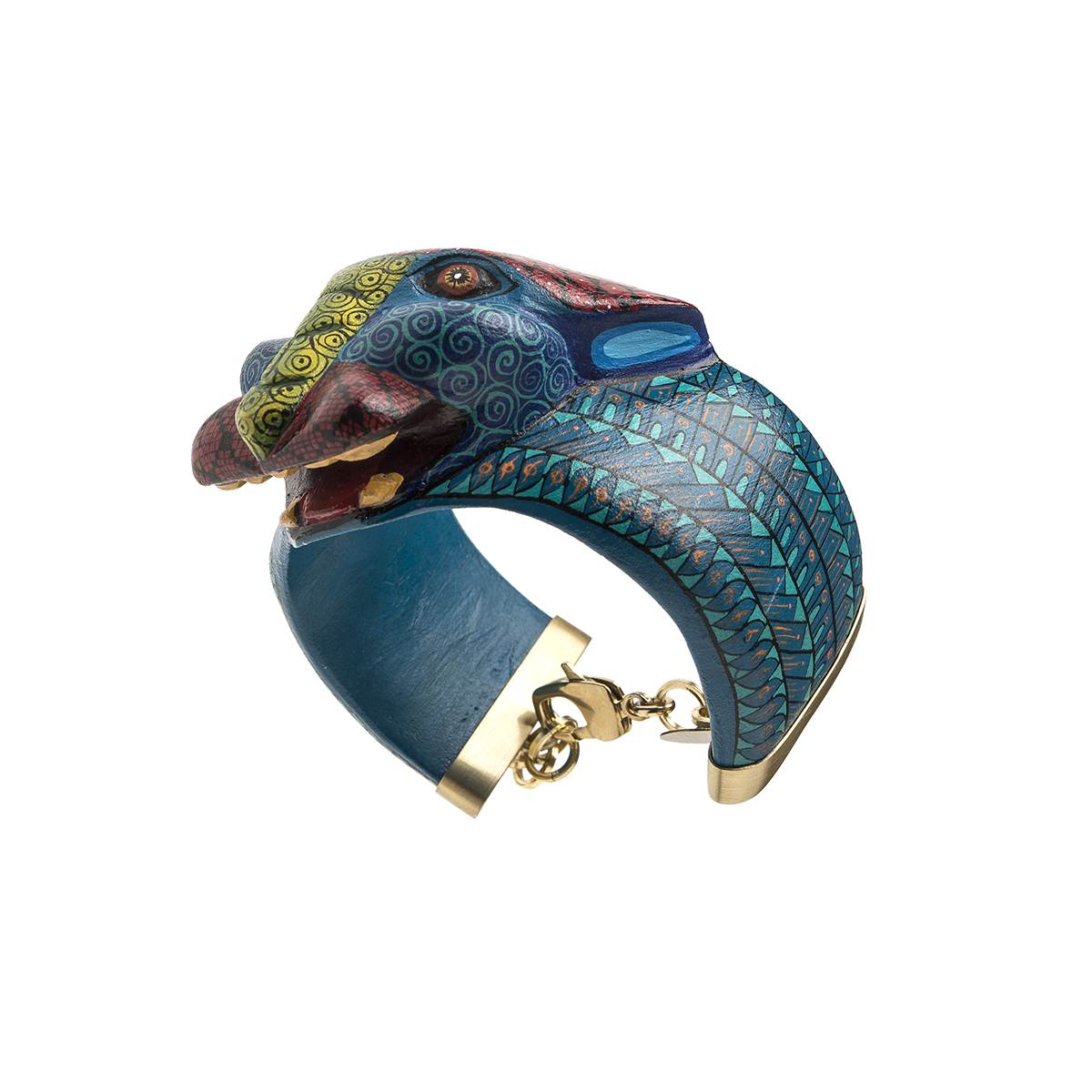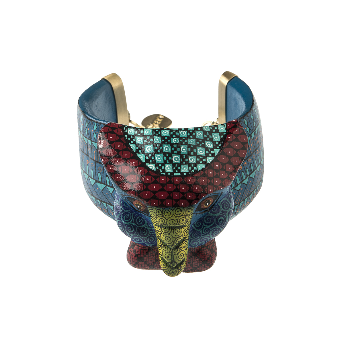 Szeroka kolorowa bransoletka inspirowana alebrijes - meksykańskimi rzeźbami wykonanymi z drewna kopalowego, ręcznie malowanymi w niebywale barwne, geometryczne wzory. Bransoletka z głową jaguara została ozdobiona symbolami zaczerpniętymi z kultury Zapoteków. Jaguar symbolizuje wewnętrzną moc, odwagę, pewność siebie ale i siłę serca. Artystyczna biżuteria została wykończona mosiężnymi elementami oraz zapięciem z podwieszonym logo ORSKA. Bransoletka jest unikatowa, podobnie jak pozostała biżuteria z kolekcji Meksyk.