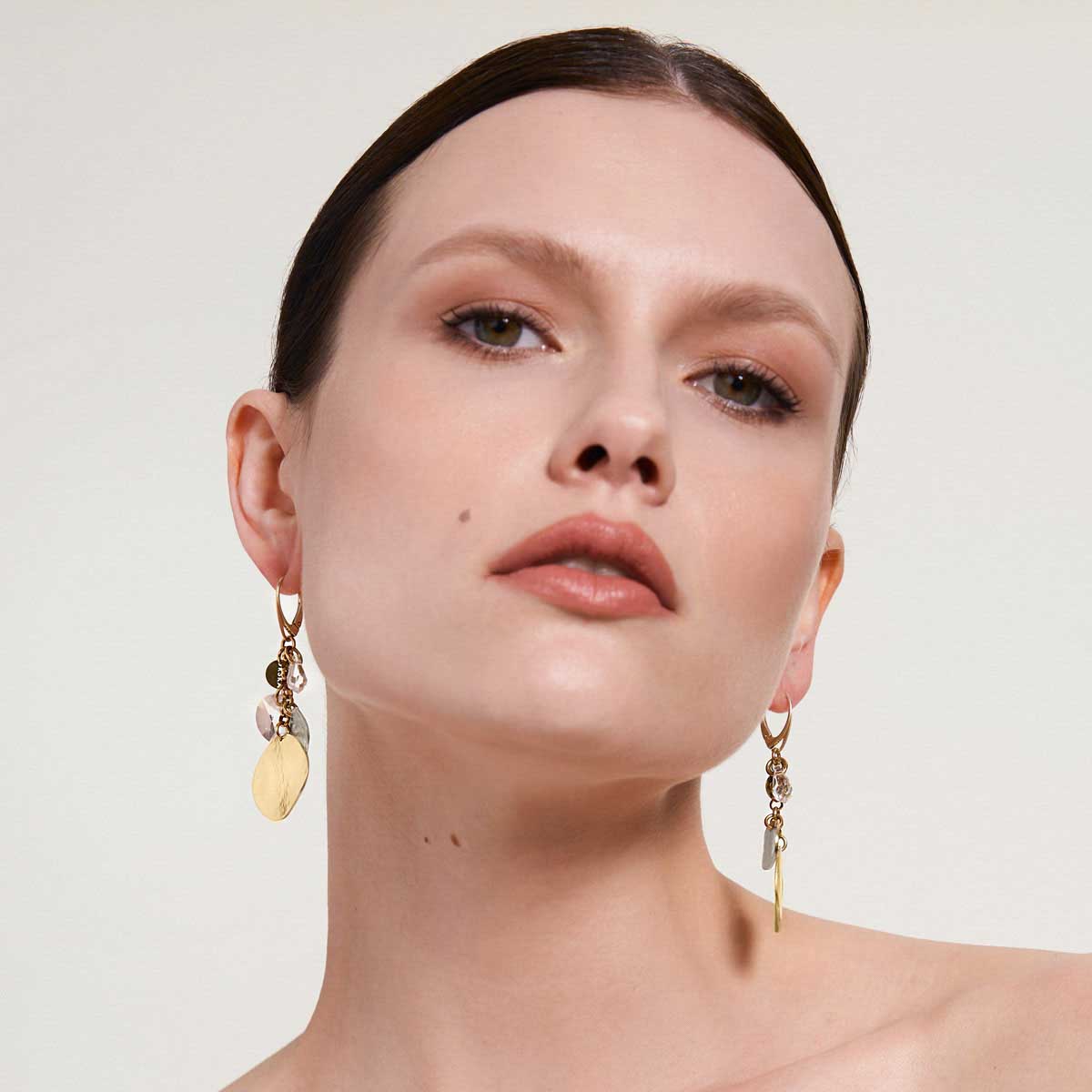 Wiszące kolczyki z iskrzącymi się w świetle kryształami to biżuteria, która będzie pasować zarówno na oficjalne spotkanie w pracy jak i na mniej formalne wyjścia z przyjaciółmi, randkę czy do kina. Długie kolczyki lubią towarzystwo zwiewnych tkanin, ale sprawdzą się nie tylko w letniej garderobie. Będą doskonałym dodatkiem także do grubych swetrów czy miękkich szali. Kolczyki świetnie wyglądają solo, jednak szczególnie efektownie prezentują się w towarzystwie innych wzorów. Zestaw je z okazałą bransoletą lub oryginalną broszką z tej samej kolekcji i śmiało przyciągaj uwagę. Złotą biżuterię o podobnej, nieregularnej powierzchni znajdziesz również w kolekcji Moon. A jeśli potrzebujesz większej dawki inspiracji polecamy wpis na naszym blogu o tym jak łączyć różną biżuterię.