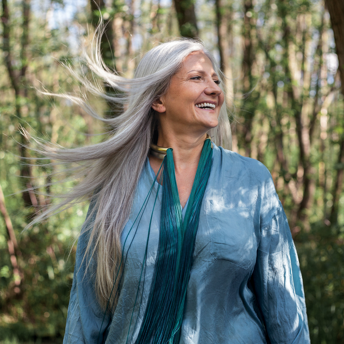Anna Orska, zainspirowana barwami wakacyjnych łąk, pół i przydomowych ogródków, stworzyła pełną żywych kolorów linię biżuterii. Długi naszyjnik z zielonymi frędzlami został wykonany ręcznie. Wyrazista biżuteria o intensywnej barwie przywodzi na myśl chwile radosnego zapomnienia i harmonijnej energii. Artystyczny naszyjnik sprawdzi się jako uzupełnienie codziennych stylizacji oraz utworzy piękny zestaw z kolczykami z tej samej kolekcji.